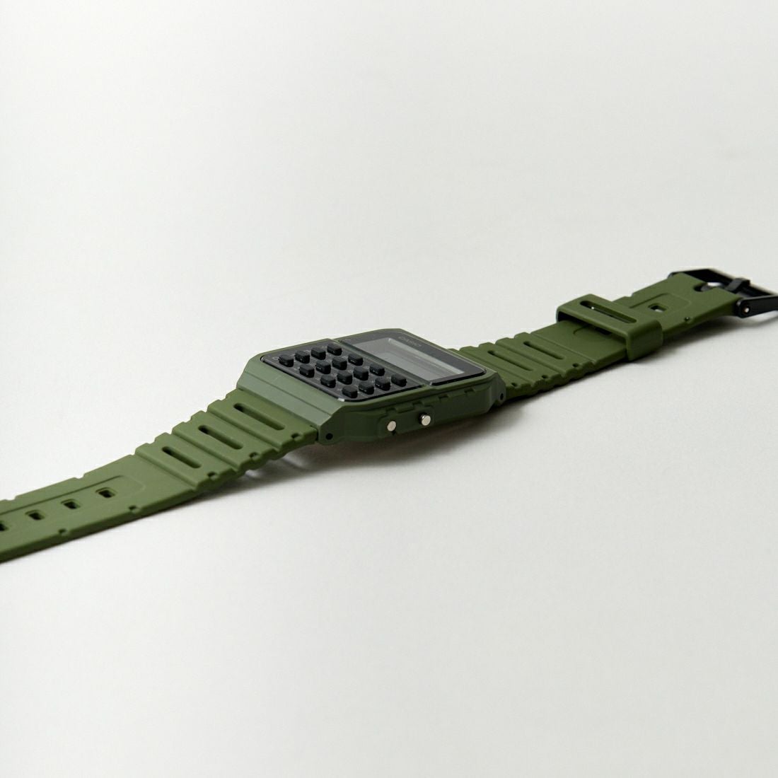 CASIO[カシオ]のカリキュレータークォーツ。文字板に電卓機能を搭載した小型デジタルウオッチです。ベースカラーは男性でも女性でも着けやすいアースカラーを採用。反転液晶と、液晶周りの機能表記を限りなく減らしミニマルなデザインに仕上げることで、モダンでありながらもレトロな印象に仕上げました。機能面でも、ストップウオッチ機能やアラーム機能など日常使いに便利な機能を搭載しています。