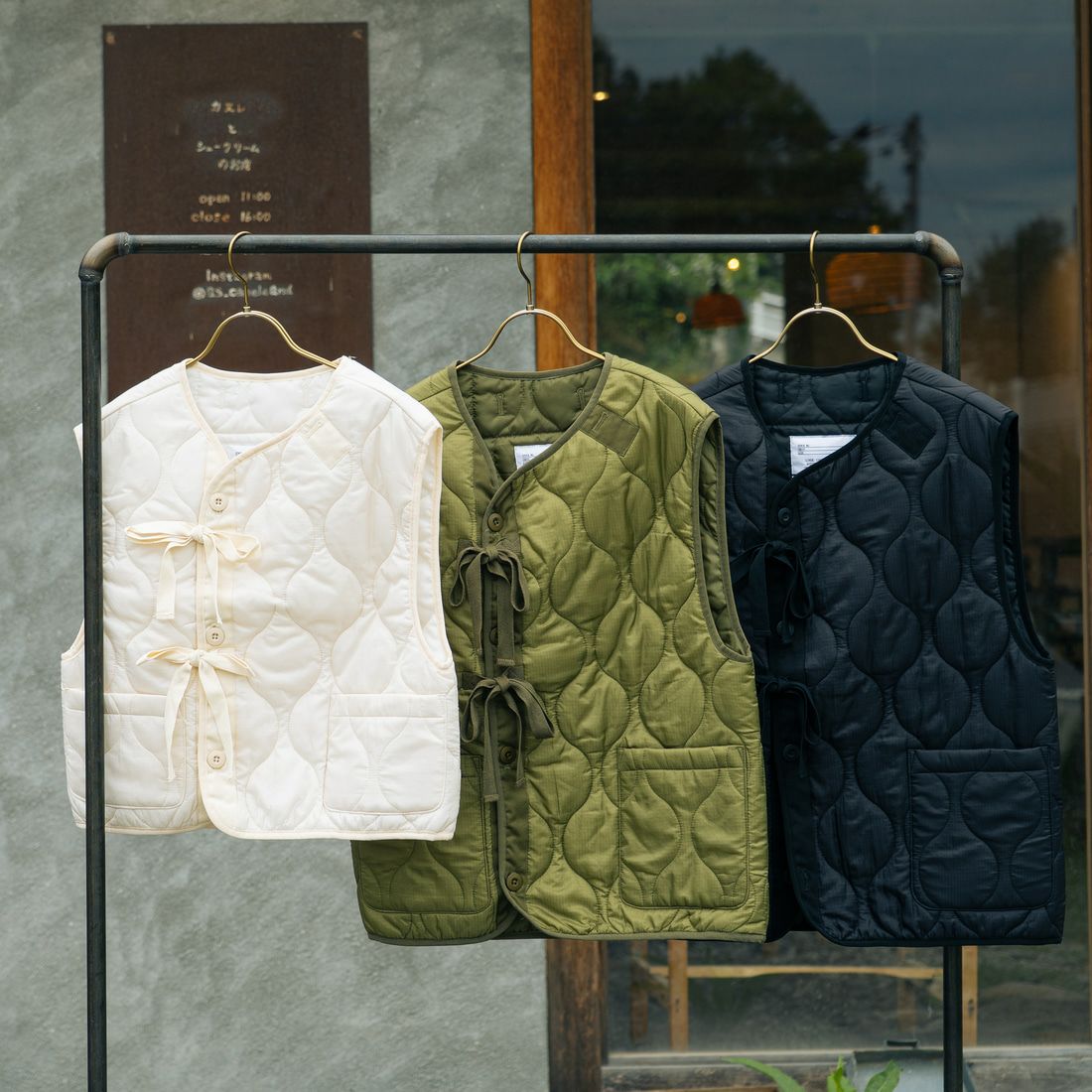 普段のスタイリングに一点投入するだけで、こなれ見えが叶うキルトライナーベスト。ミリタリーテイストのアイテムならではのひょうたん柄キルトが大人カジュアルな着こなしにマッチ。すっきりとした女性らしい印象を醸し出すノーカラー仕様になっています。フロントに配したダブルリボンがフェミニンな雰囲気を演出。さっと羽織った時に、後ろの裾がふわっと広がるややワイドなシルエット。程良くヒップを隠してくれるミドル丈デザインで、体型カバー効果も期待できます。インナーにビッグシルエットのニットやスウェットも着られるので、真冬まで着回しが効くところが嬉しいポイント。耐久性に優れたリップストップ生地を採用し、中綿入りで保温性が高く、ふんわりと軽い着心地なので、屋内での防寒着としても活躍するアイテムです。 ※こちらの商品のSサイズはコンパクトなシルエットになっております。サイズ表記をご確認の上、お買い求めください。
