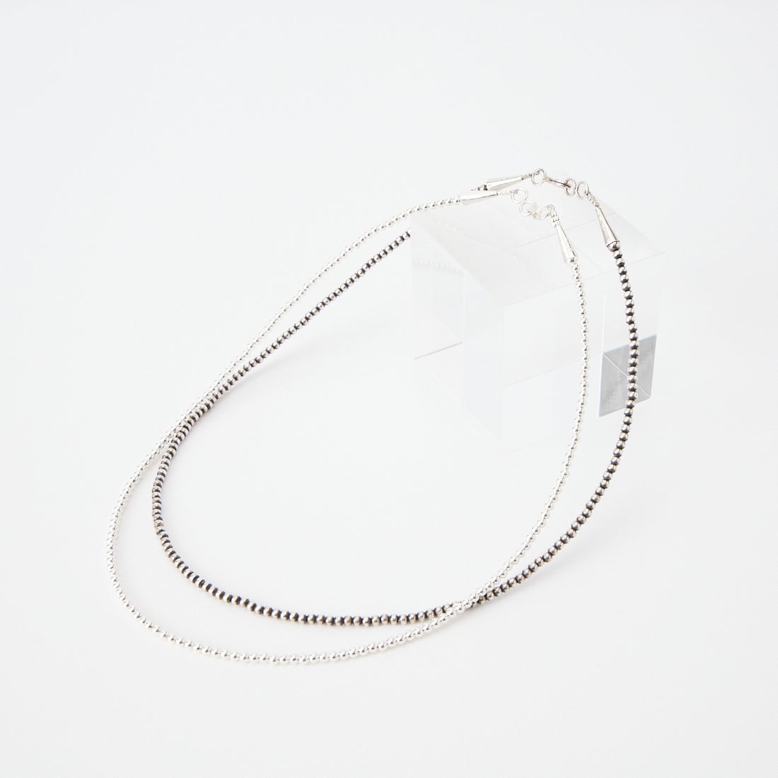 ナバホ族の女性アーティストが作るインディアンジュエリー・ナバホパール ネックレス。(パール幅3mm、長さ50cm)女性らしさを最大限に活かしたデザインで、素材にもこだわり、シルバーを溶かすところからはじまる手作りの柔らかい質感と洗練された雰囲気が魅力。シンプルなデザインは、お手持ちのアクセサリーとのコーディネートもお楽しみいただけます。