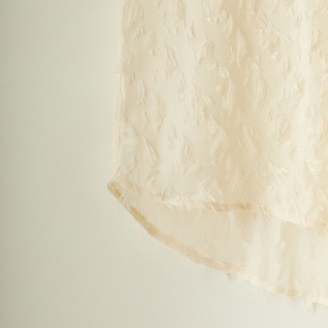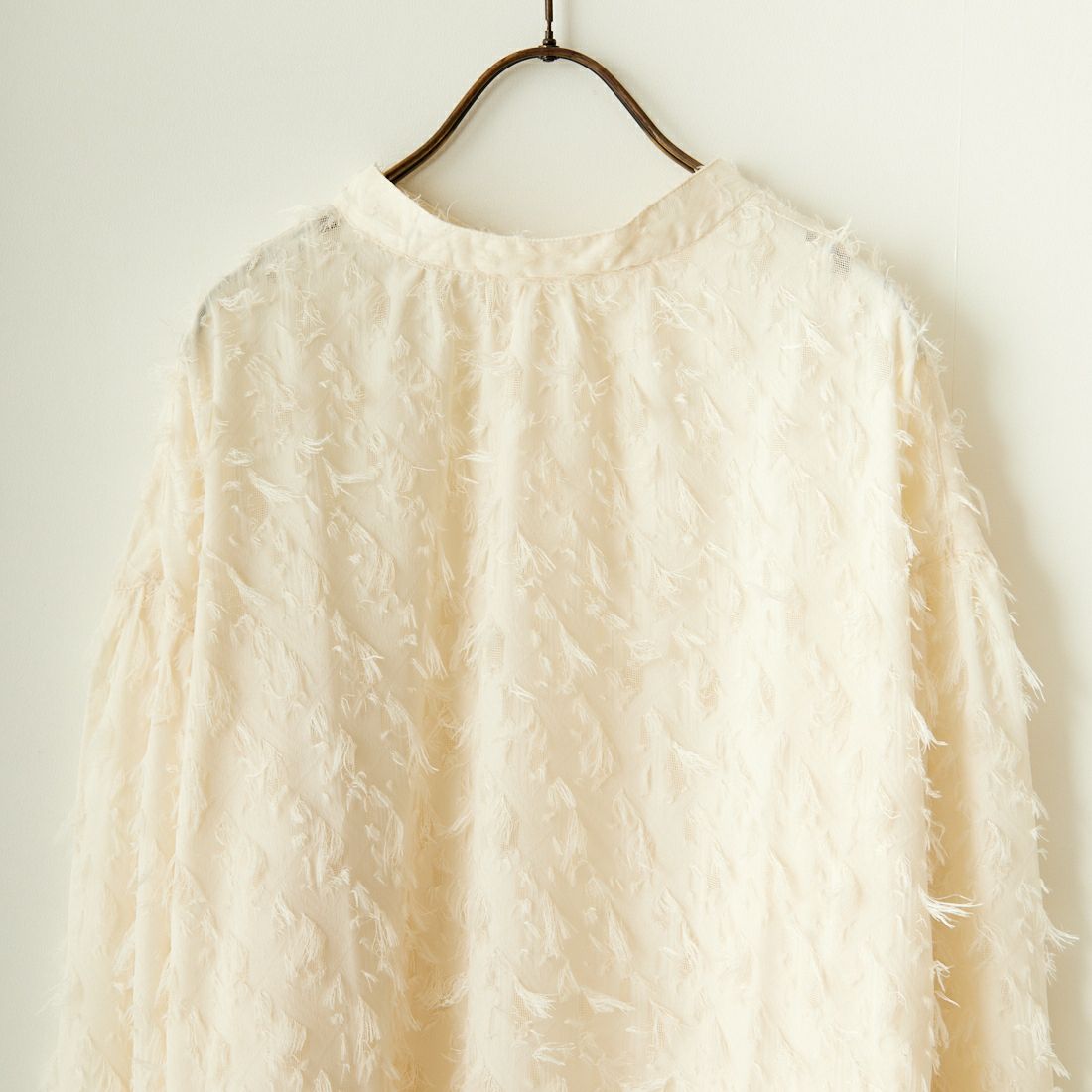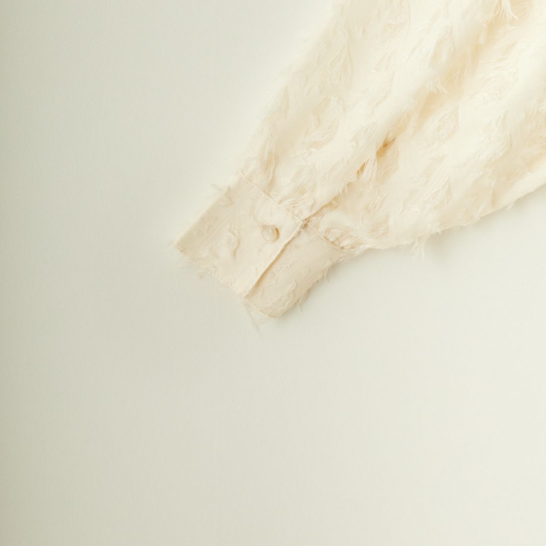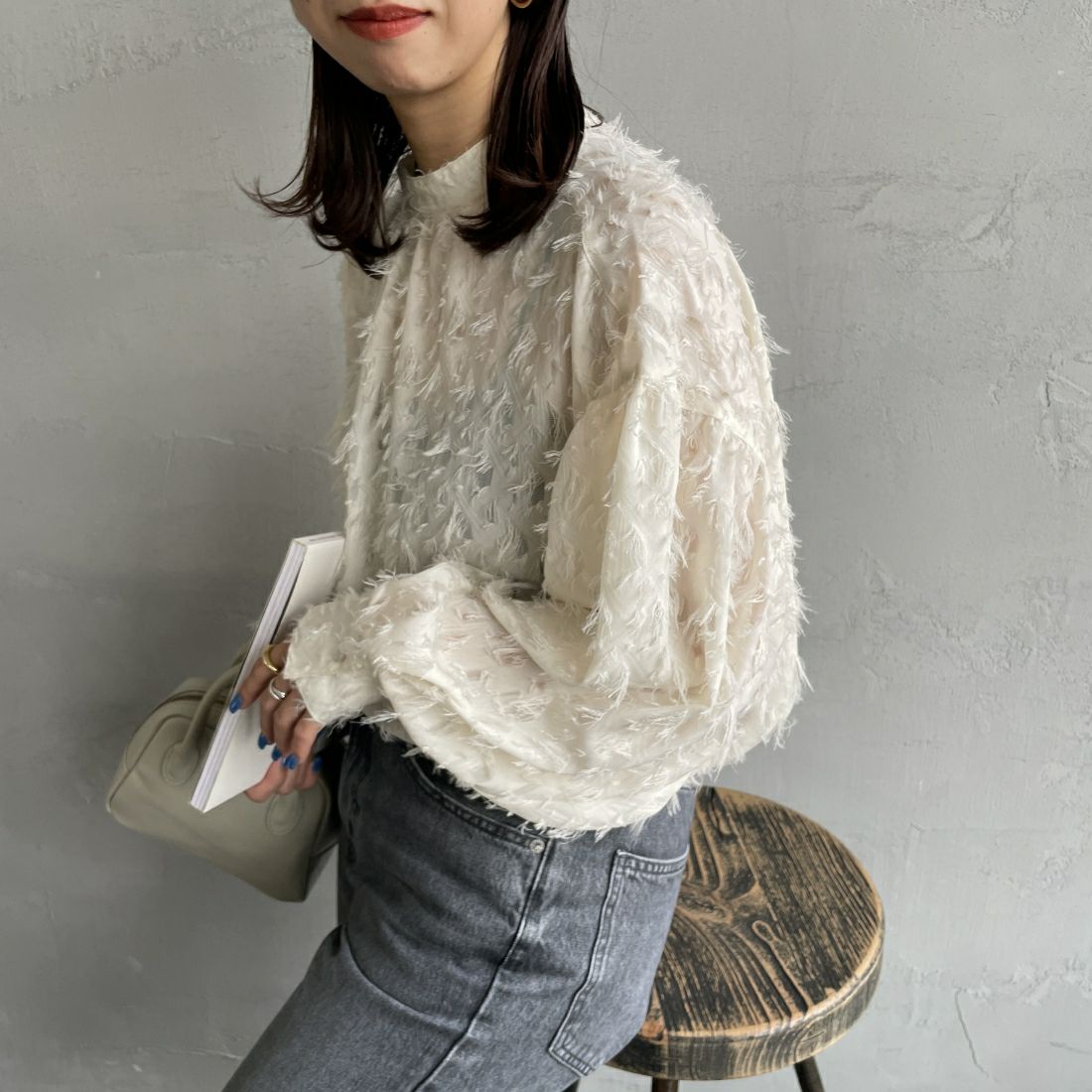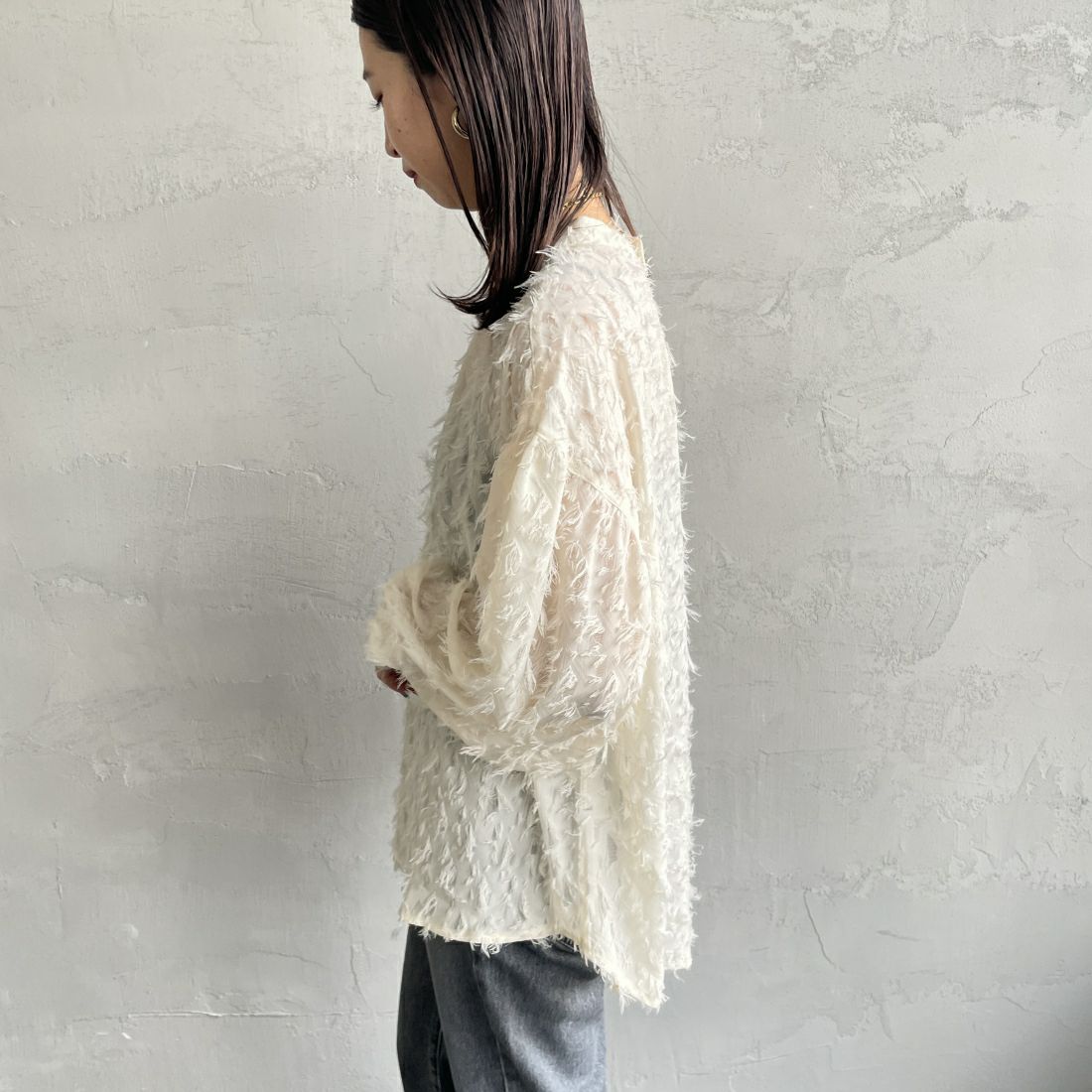 By/m[バイエム]のジャガードフリンジ フェザーブラウス。繊細なフリンジ加工が施されたカットジャガード生地を使用。柔らかなシアー感が女性らしさを惹き立てる、今シーズン一着は持っておきたいトレンドアイテムです。コンパクト過ぎず、身幅に程良くゆとりを持たせたルーズシルエット。着丈にほんのりと前後差を付け、後ろはヒップが隠れる長め丈に。同素材を使用したジャガードフリンジスカート(品番:23142061)とのセットアップスタイルもおすすめです。
