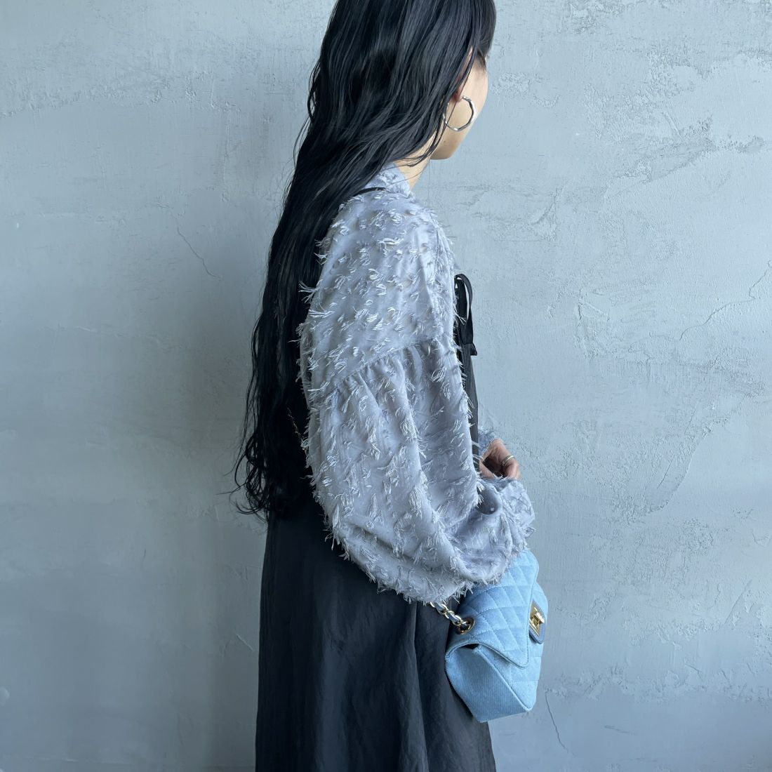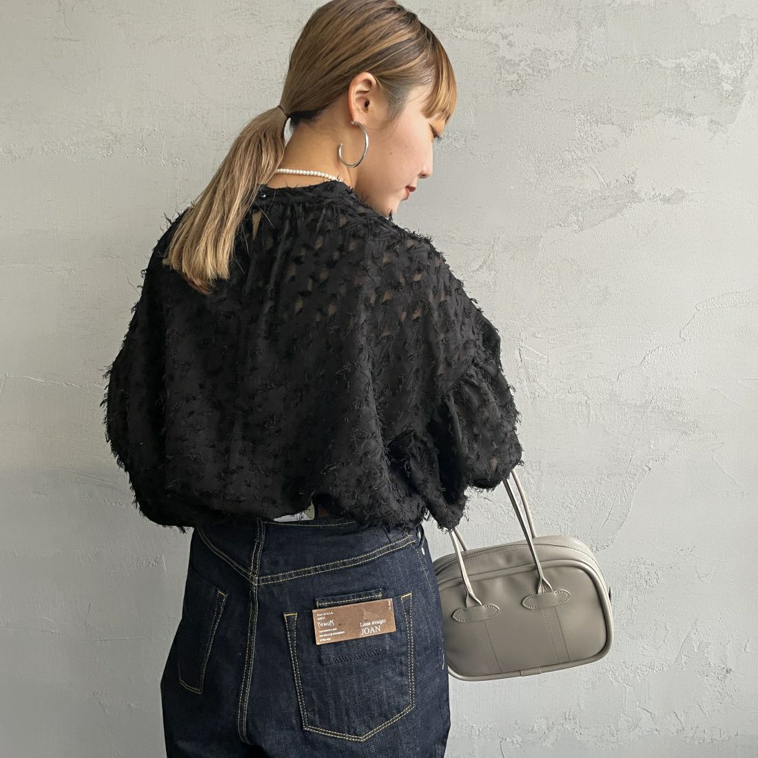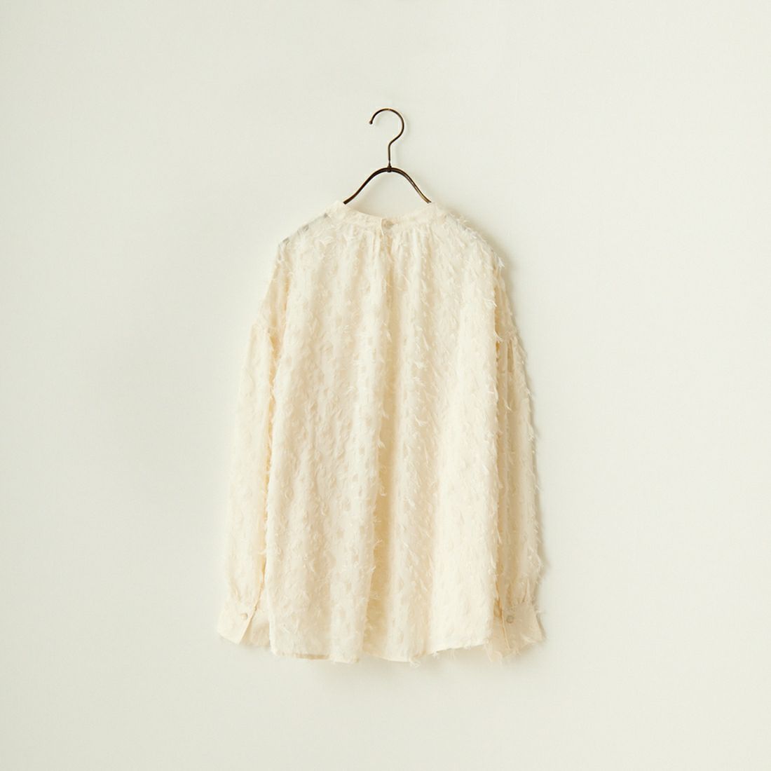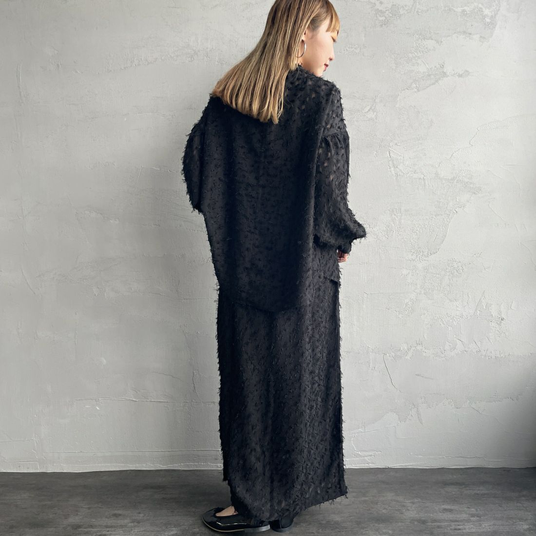 By/m[バイエム]のジャガードフリンジ フェザーブラウス。繊細なフリンジ加工が施されたカットジャガード生地を使用。柔らかなシアー感が女性らしさを惹き立てる、今シーズン一着は持っておきたいトレンドアイテムです。コンパクト過ぎず、身幅に程良くゆとりを持たせたルーズシルエット。着丈にほんのりと前後差を付け、後ろはヒップが隠れる長め丈に。同素材を使用したジャガードフリンジスカート(品番:23142061)とのセットアップスタイルもおすすめです。