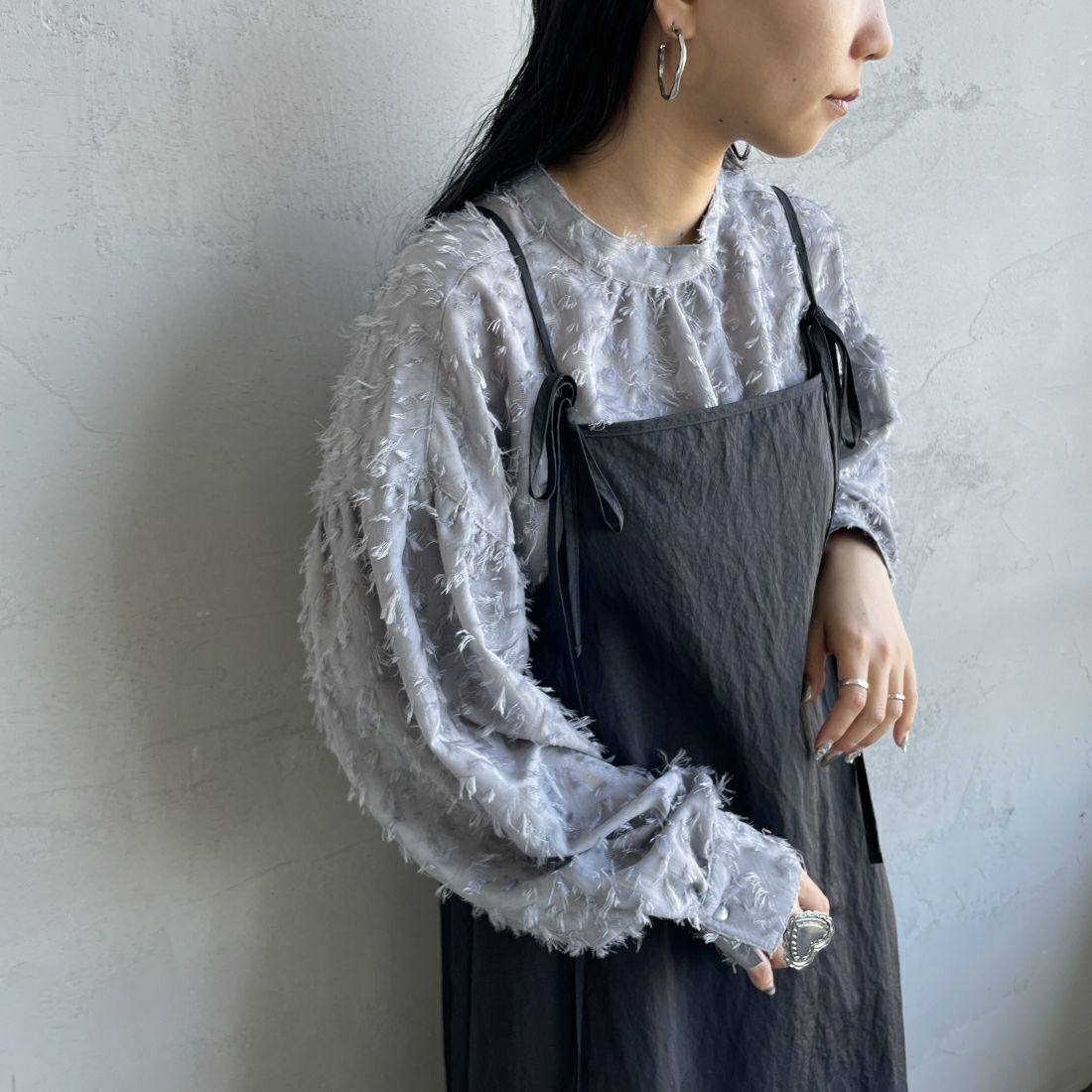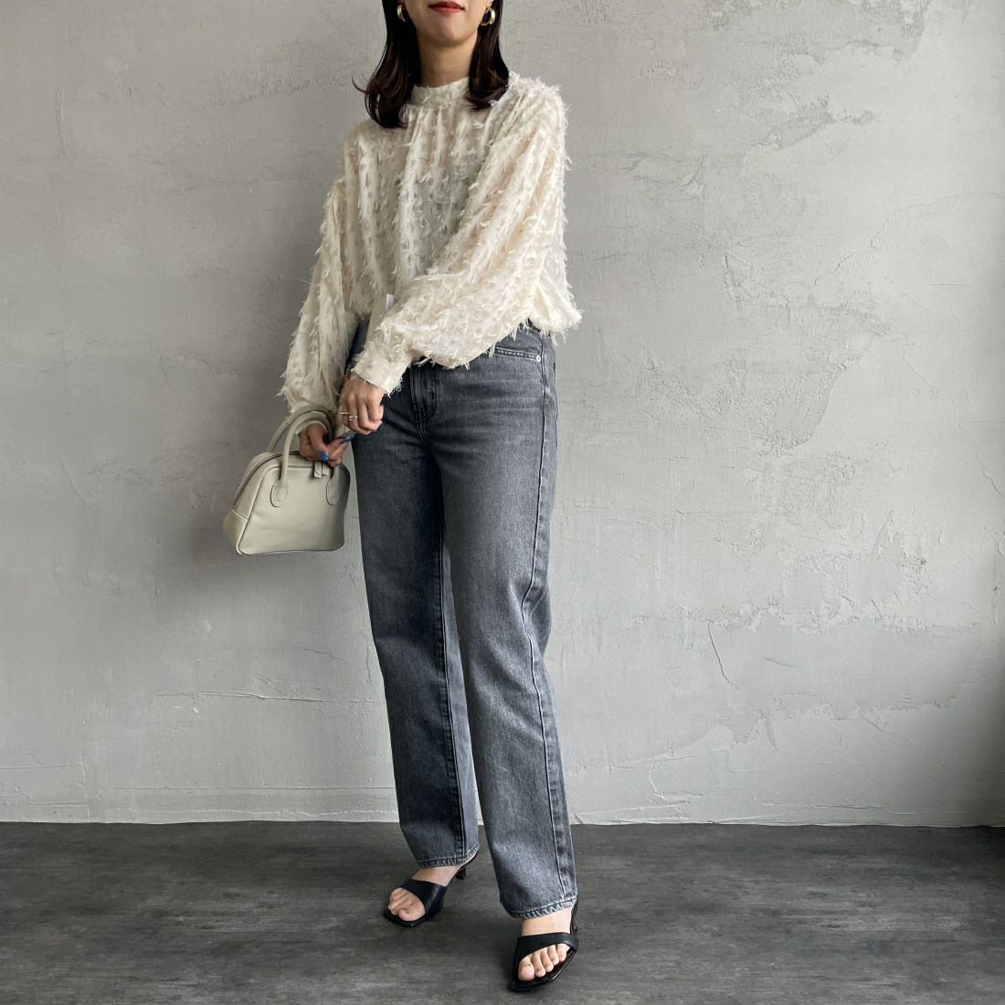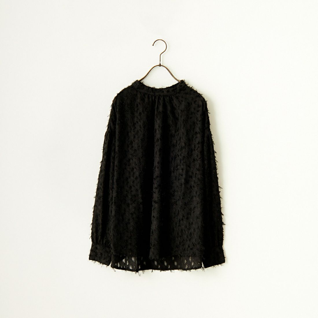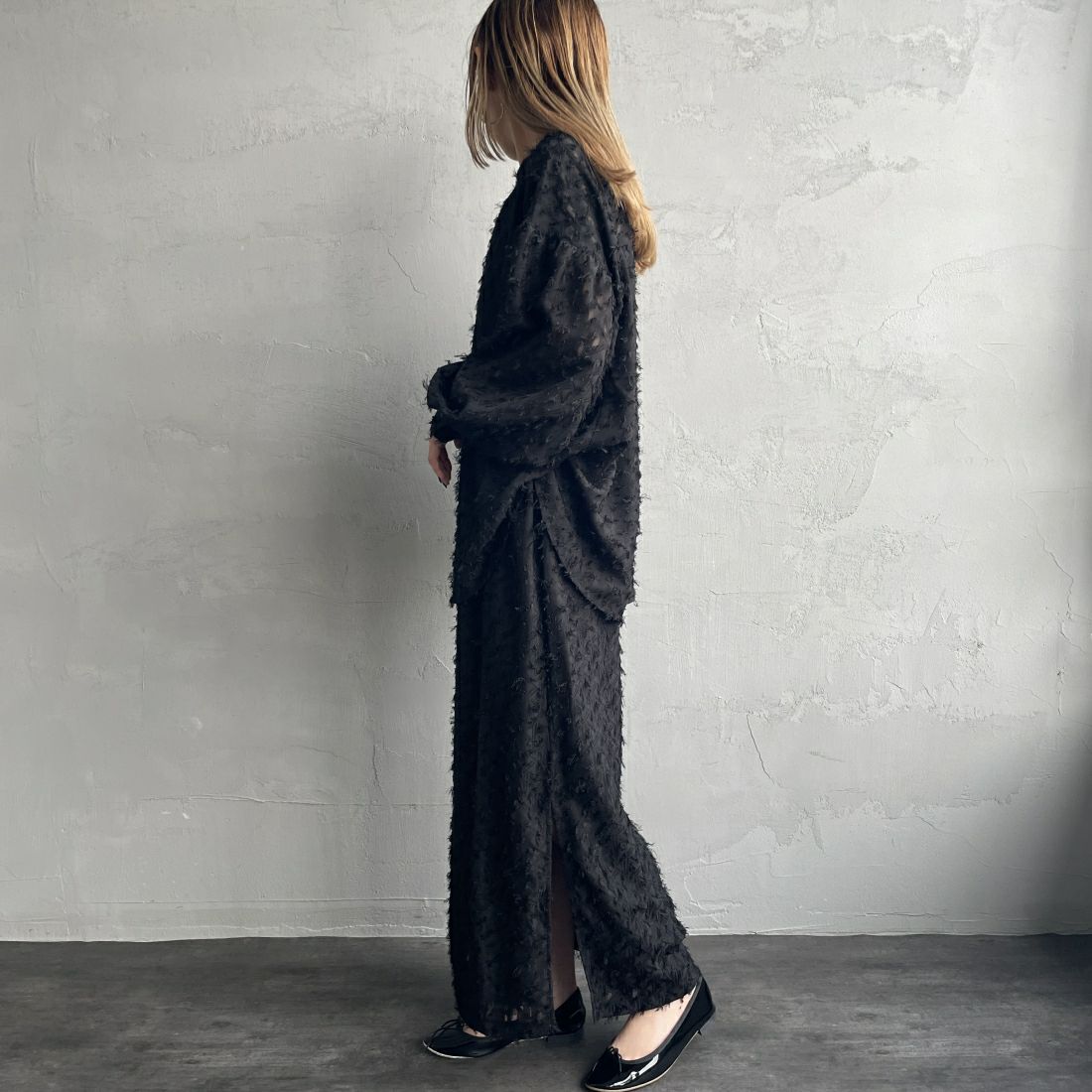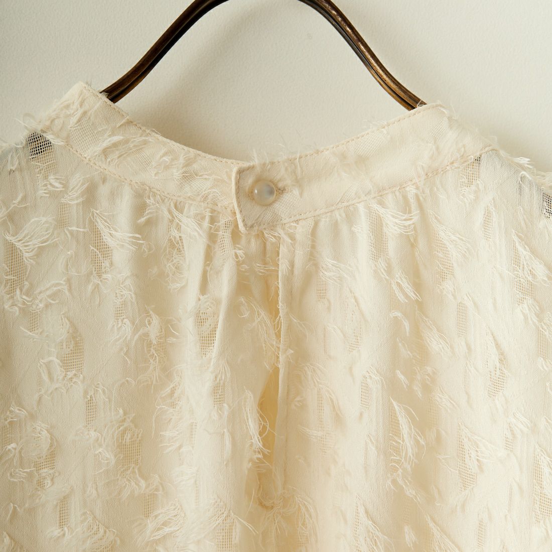 By/m[バイエム]のジャガードフリンジ フェザーブラウス。繊細なフリンジ加工が施されたカットジャガード生地を使用。柔らかなシアー感が女性らしさを惹き立てる、今シーズン一着は持っておきたいトレンドアイテムです。コンパクト過ぎず、身幅に程良くゆとりを持たせたルーズシルエット。着丈にほんのりと前後差を付け、後ろはヒップが隠れる長め丈に。同素材を使用したジャガードフリンジスカート(品番:23142061)とのセットアップスタイルもおすすめです。