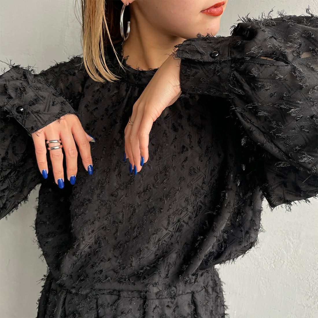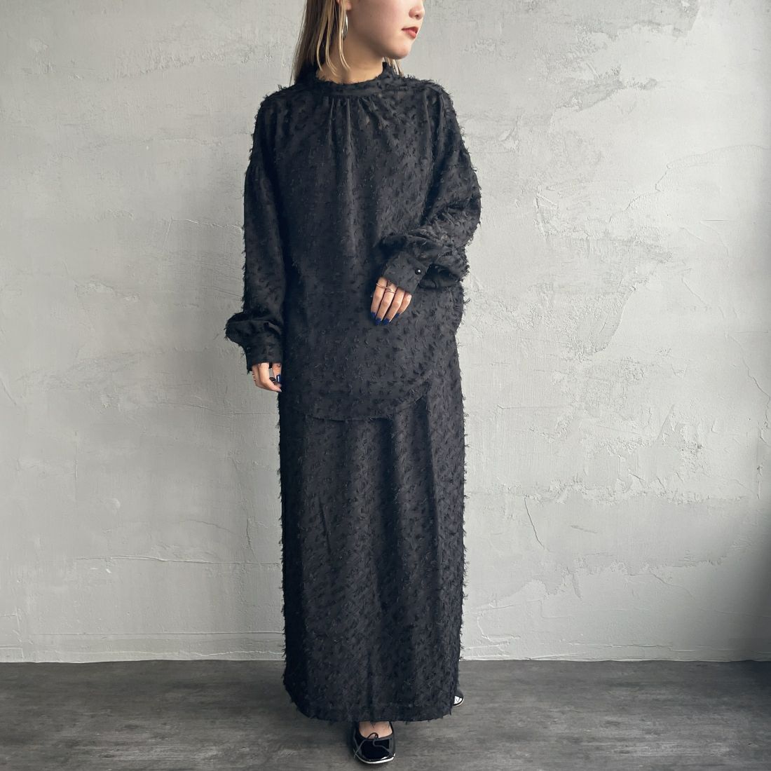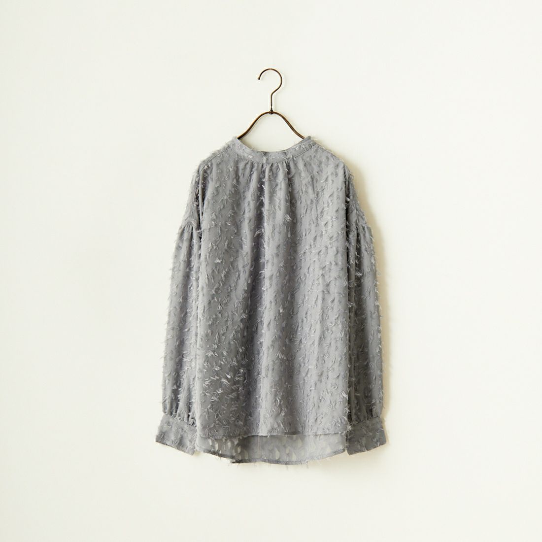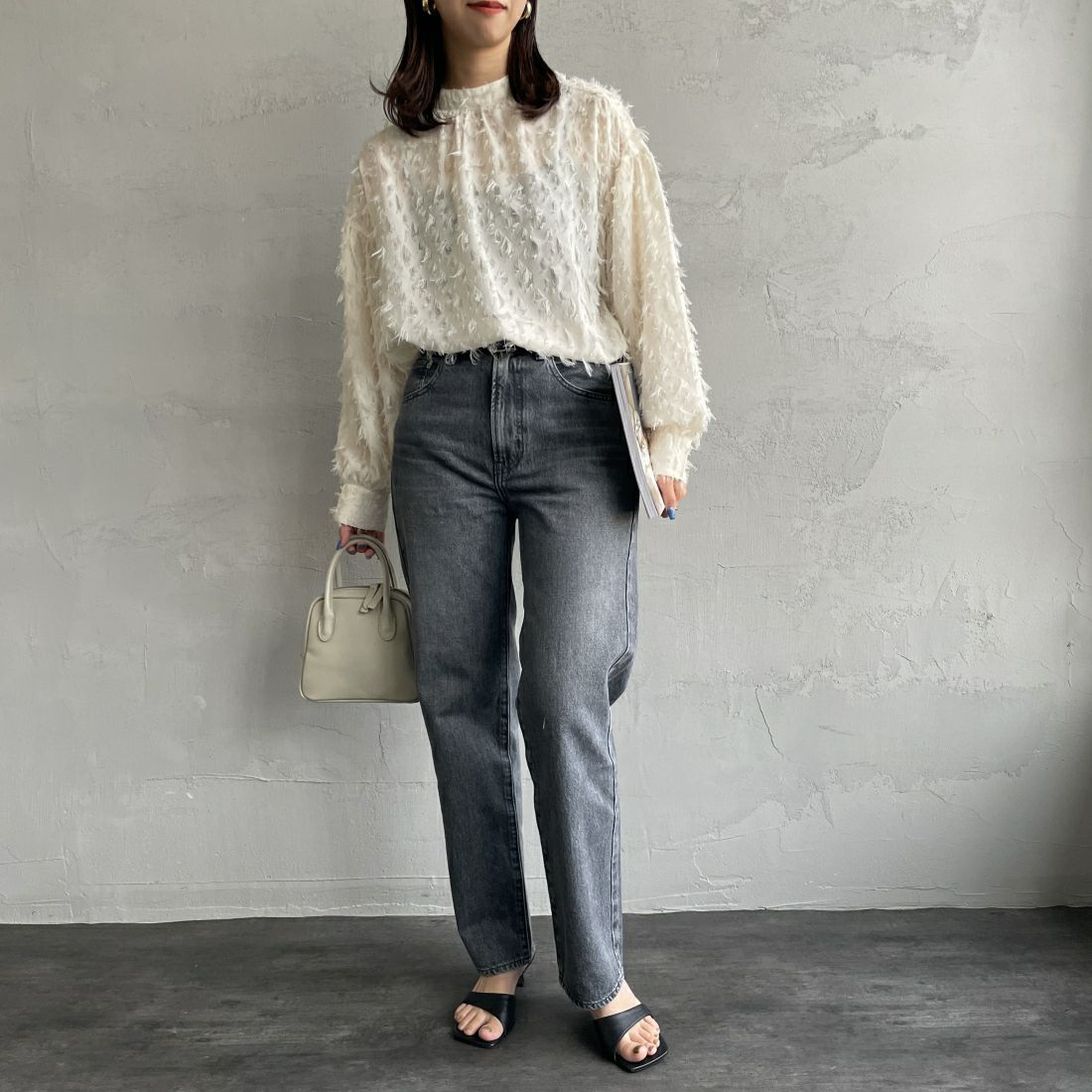 By/m[バイエム]のジャガードフリンジ フェザーブラウス。繊細なフリンジ加工が施されたカットジャガード生地を使用。柔らかなシアー感が女性らしさを惹き立てる、今シーズン一着は持っておきたいトレンドアイテムです。コンパクト過ぎず、身幅に程良くゆとりを持たせたルーズシルエット。着丈にほんのりと前後差を付け、後ろはヒップが隠れる長め丈に。同素材を使用したジャガードフリンジスカート(品番:23142061)とのセットアップスタイルもおすすめです。