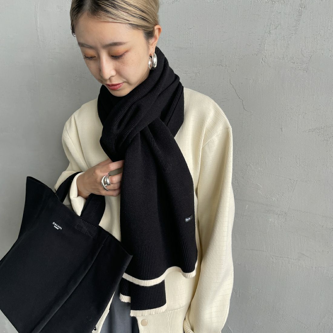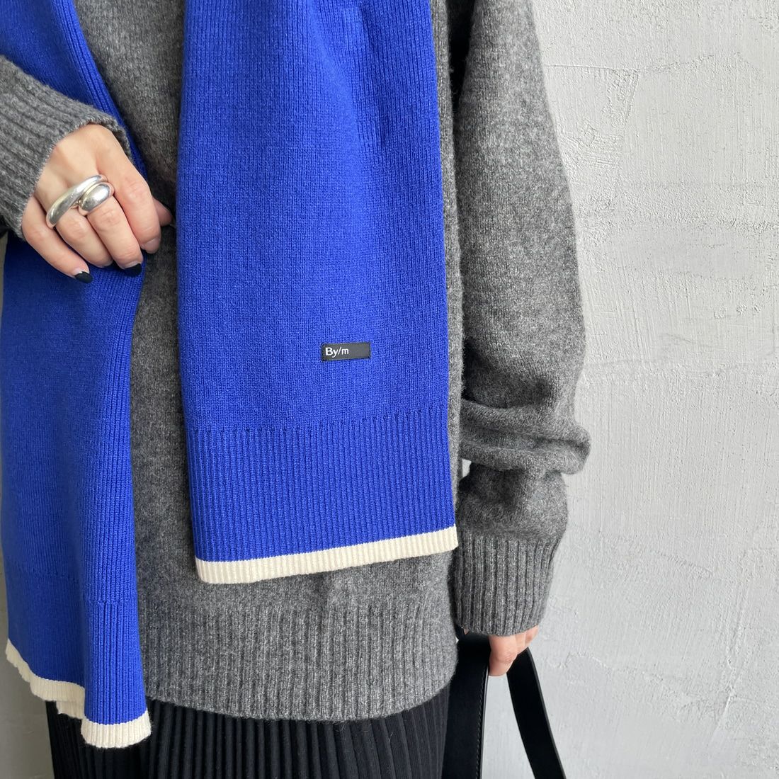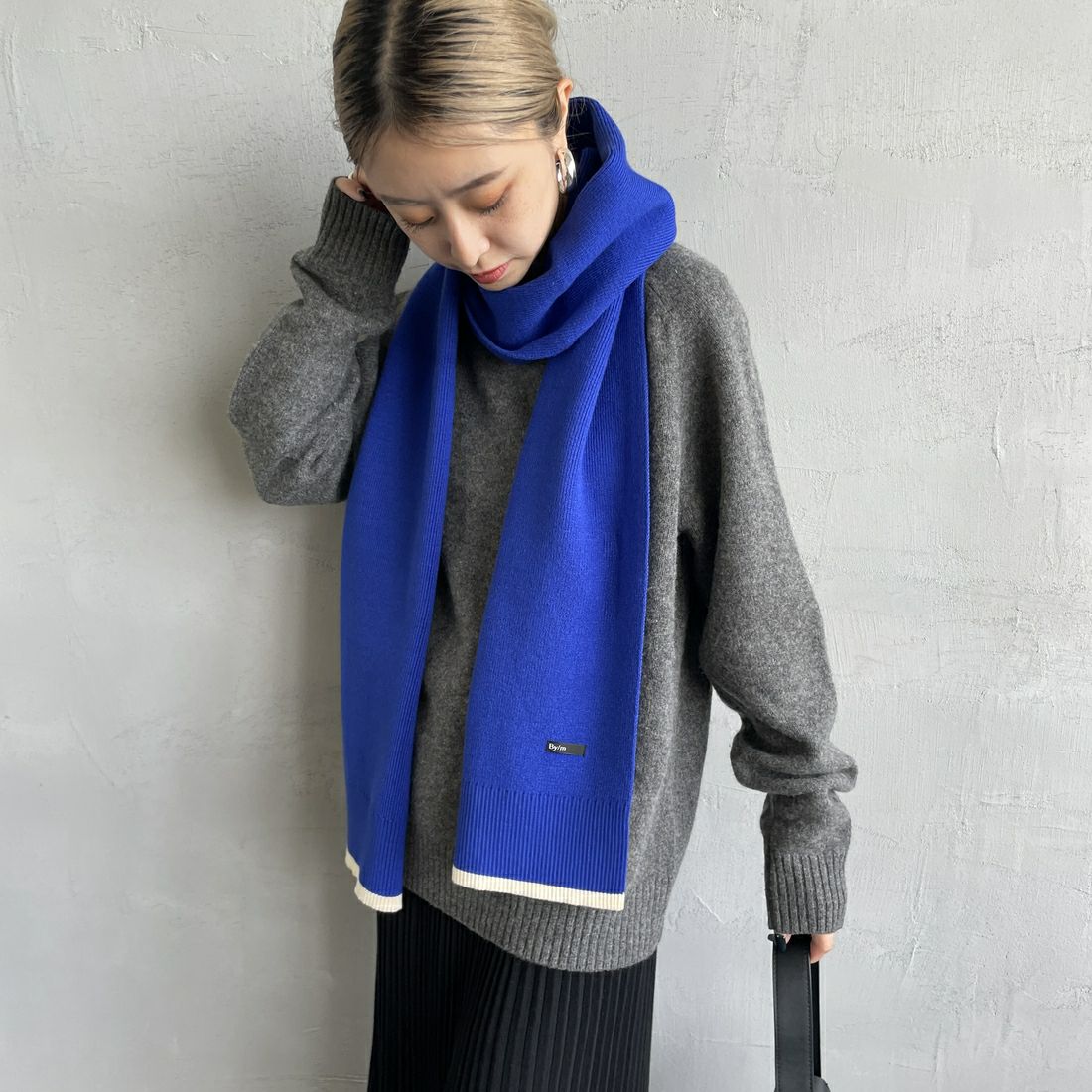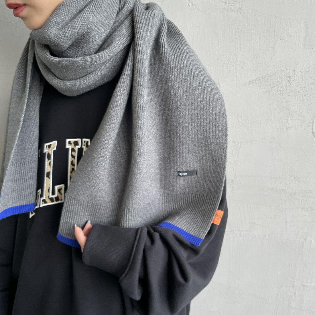 By/m[バイエム]のバイカラーマフラー。配色ラインのコントラストが目を惹くバイカラーマフラー。トーンが暗くなりがちな秋冬の装いのポイントになる、アクセサリー感覚で使えるトレンドライクなデザインが魅力的。チクチクしない柔らかな肌触りと、ふんわりと優しいスポンディッシュな着け心地が特徴で、シーズンムードを盛り上げてくれる、見た目も暖かなアイテムです。しっかりと長さがあるので、様々な着け方のアレンジが楽しめます。
