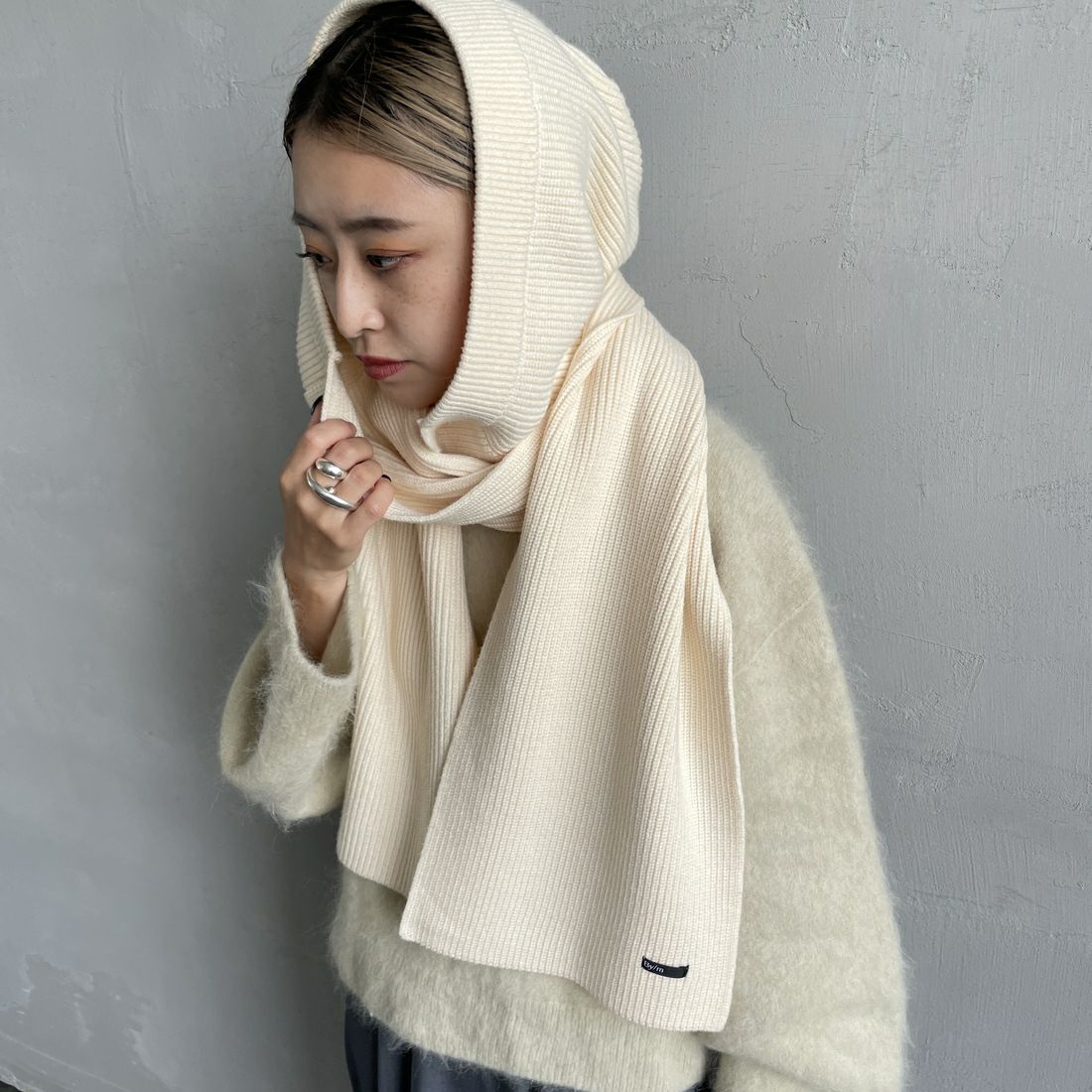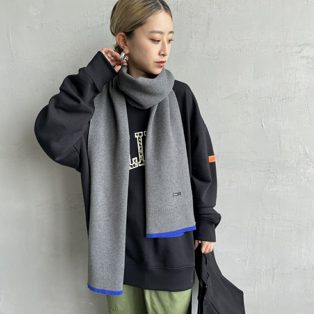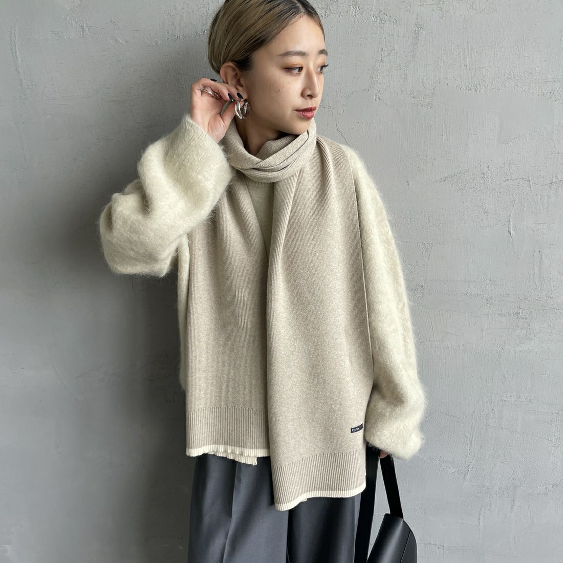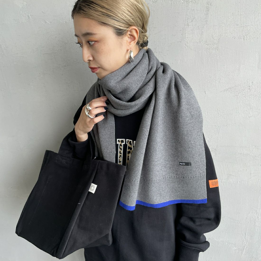 By/m[バイエム]のバイカラーマフラー。配色ラインのコントラストが目を惹くバイカラーマフラー。トーンが暗くなりがちな秋冬の装いのポイントになる、アクセサリー感覚で使えるトレンドライクなデザインが魅力的。チクチクしない柔らかな肌触りと、ふんわりと優しいスポンディッシュな着け心地が特徴で、シーズンムードを盛り上げてくれる、見た目も暖かなアイテムです。しっかりと長さがあるので、様々な着け方のアレンジが楽しめます。