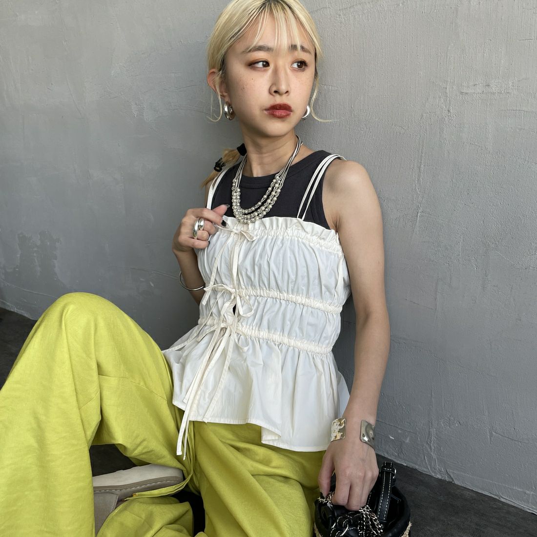 nenom[ネノム]のマルチWAYギャザービスチェ。シャカシャカでマットな質感のナイロン素材を使用したビスチェ。適度なハリのあるぱりっとした生地感で、ギャザーに立体感が出て程良くボリューミーな印象になっています。前後どちらでも着用でき、さらに肩紐を外してベアトップとしても着られる3WAY仕様になっています。表面にほのかな光沢があり、カジュアルなトップスとのミックスコーデもサマになるアイテムです。