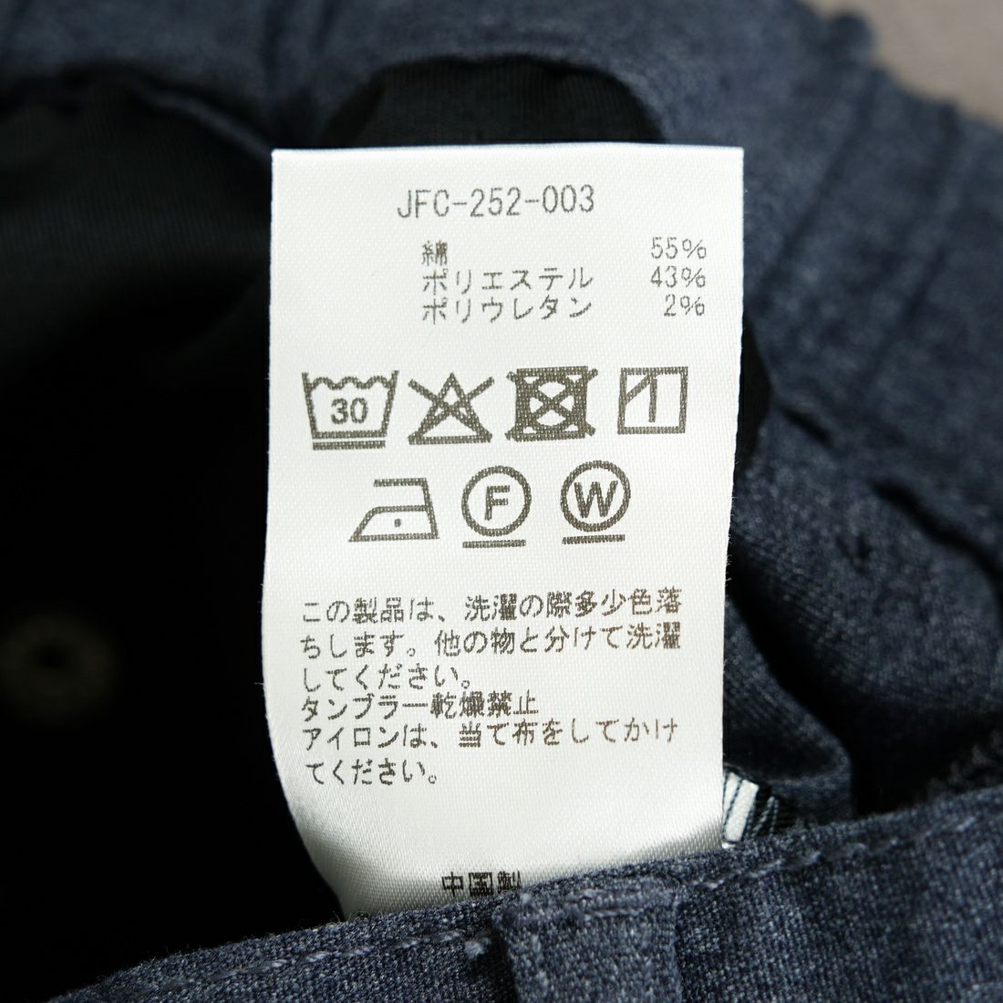 綿とポリエステルの混紡生地を使用。綿100%のものに比べてシワになりにくく、摩擦に強い生地で綿、ポリエステルの混紡割合により生まれる絶妙なシボ感と光沢感に独特のメランジ感が魅力です。またストレッチ混による運動性で穿き易さ抜群のパンツに仕上がりました。裾に向かってやや細くなっているテーパードシルエットでスタイルアップ効果も期待できます。1Pイージートラウザーに関して全体に少しタイトとお声もあり、前シーズンからシルエットを見直しています。