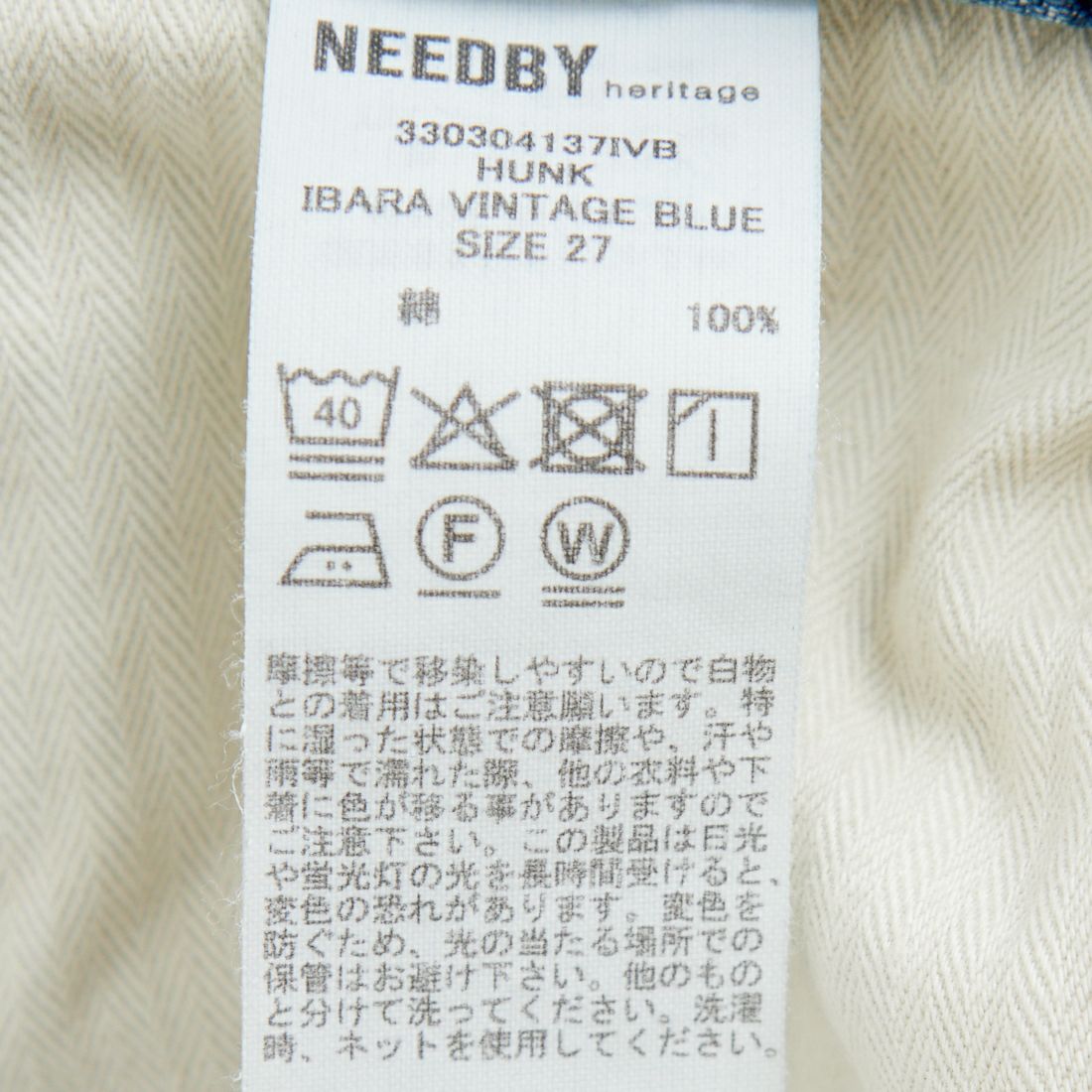 NEEDBY heritageのミッドライズワイドストレートモデル「HUNK(ハンク)」。ウエストにはサイズ調整が可能な釦を備え、ジャストウエストでも腰履きでも着用できる汎用性の高い一本です。素材には、9ozの軽さと重厚感のあるシボ感を両立した綿100%デニムを採用。デニムとしては細番手の糸を使用し、高密度に織り上げることで、デニムらしい豊かな加工感が表現されています。さらに、カイハラのD-SPEC ECOを使用し、最濃色かつ芯白が大きいインディゴブルーで染色。メリハリのある色落ちが楽しめ、加工映えのする素材感も魅力です。