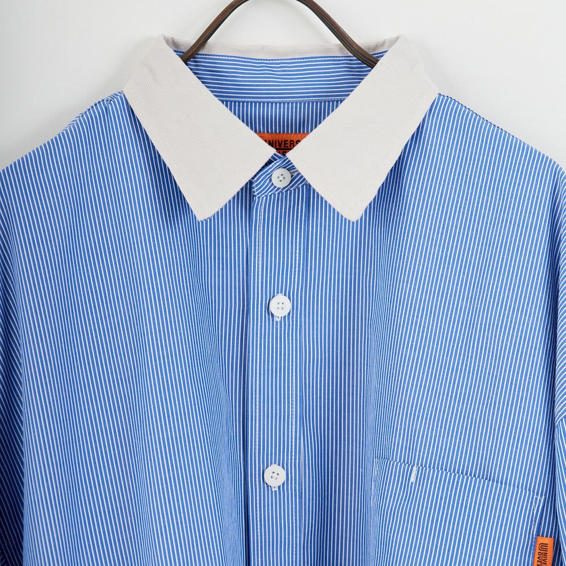 UNIVERSAL OVERALLならではの抜け感のあるシルエットで、大人カジュアルに着こなせる別注パジャマシャツ。ドロップショルダーとワイドな身幅で、トレンド感のあるオーバーサイズシルエットが魅力です。襟部分にはコーデュロイ素材を切り替えており、スタイリングに奥行きをプラス。左胸にはブランドを象徴するオレンジタグが施されており、ワンポイント効いたアクセントに。やや光沢感のある上品な質感の生地を採用することで、程よく落ち着いた大人の印象に仕上がっています。キレイめからストリート・ワークテイストまで幅広くマッチする汎用性の高さも魅力。端境期のライトアウターからスウェットやニットのインナーまで、ロングシーズン着回せる便利なアイテムです。