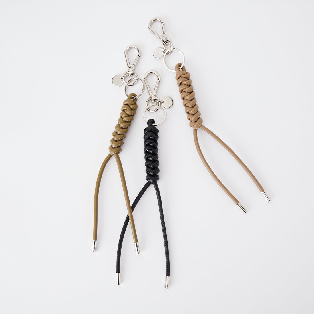 アウトドアやミリタリーの要素を取り入れた「スネークノット」の編みで仕上げたレザーコードチャーム。直径5mmの丸紐レザーに緻密なステッチを施し、メタル製のエンドパーツと刻印入りサークルチャームを組み合わせています。バッグのハンドルやベルトループに通すだけで使用でき、キーリングとしてもアクセサリーとしても活躍するレザー小物です。 ※職人によるハンドクラフト仕様のため、1点ごとに表情が異なります。