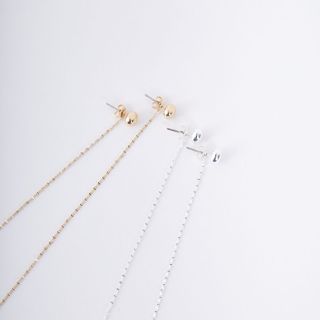 ころんとした卵型モチーフに繊細なチェーンを組み合わせた、上品な揺れ感が魅力のロングチェーンピアス。シンプルながらも存在感のあるデザインで、動くたびにきらりと光を反射し、顔周りを華やかに演出します。2WAY仕様で、卵型ピアスのみ・片耳チェーン付き・他のピアスと組み合わせるなど、多彩なアレンジが楽しめるのもポイント。ミニマルな装いにアクセントを添え、デイリーから特別なシーンまで幅広く活躍するアイテムです。
