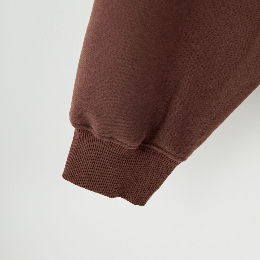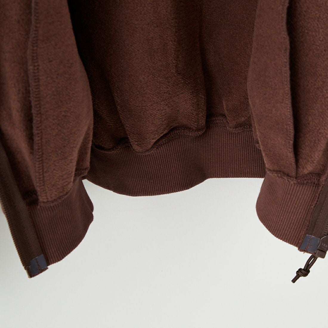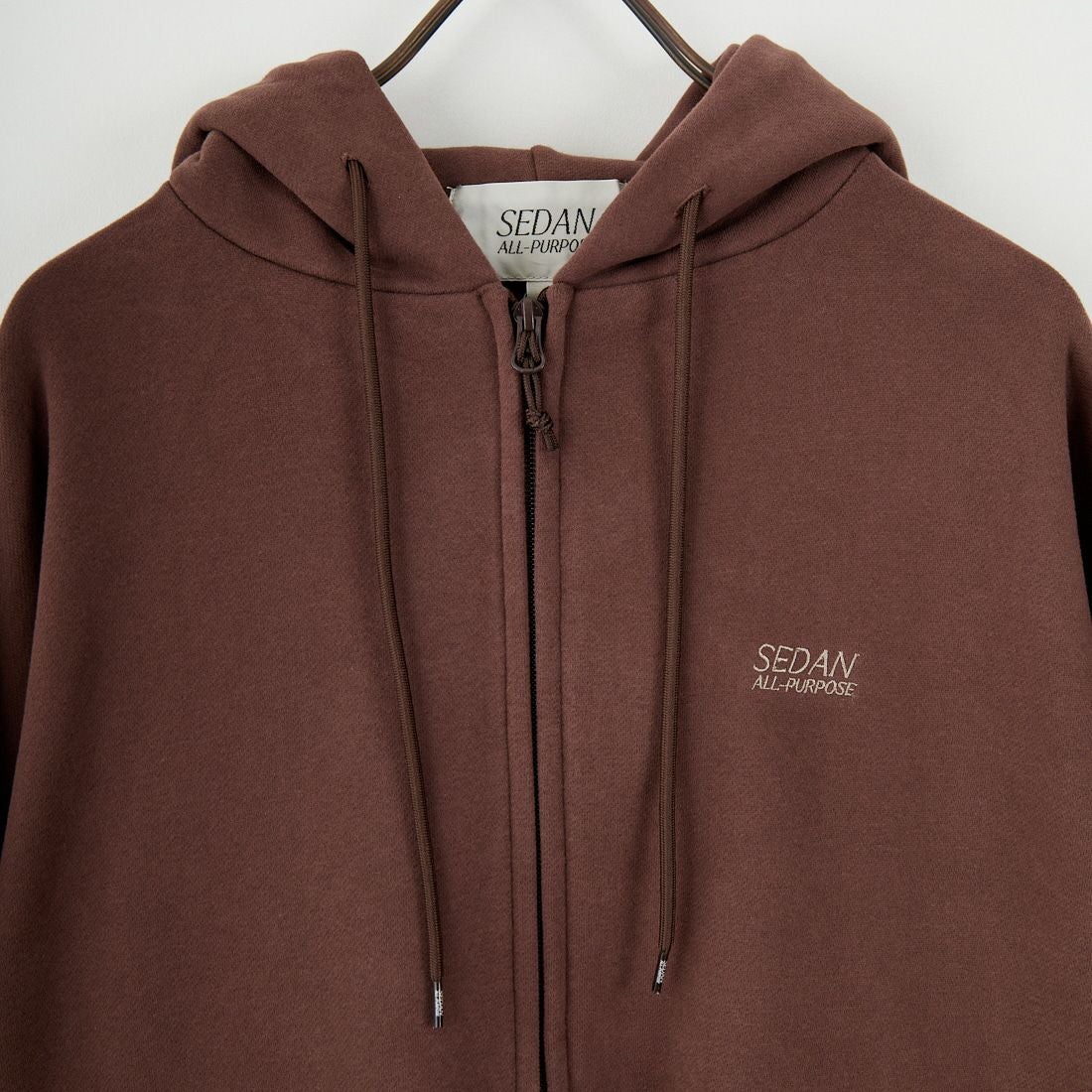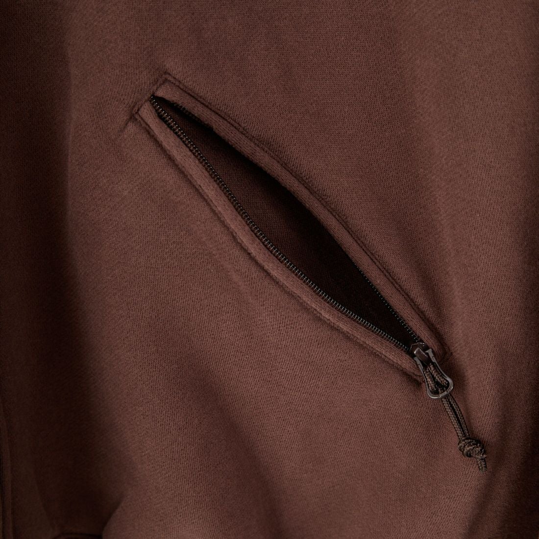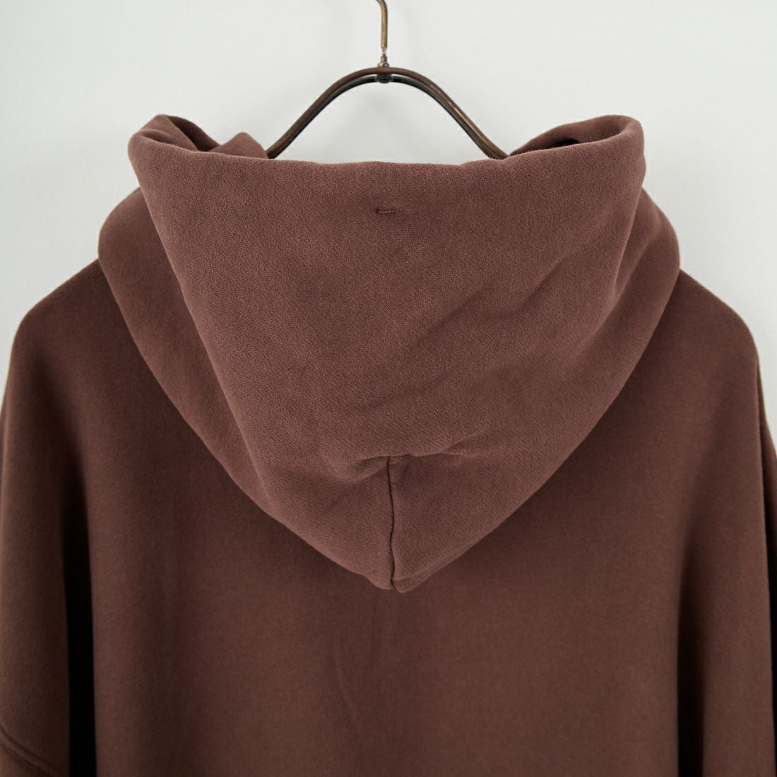 軽くてハリのあるコットン×ポリエステル素材を使用したジップアップフーディ。しっかりとしたシルエットながらも柔らかな着心地で、デイリーに活躍する一着です。身幅と着丈をほぼ同寸に設定したボックスシルエットは、インナーにビッグTシャツを合わせてももたつかず、程よい抜け感を演出。フロントのファスナーポケットがワークテイストをさりげなくプラスし、実用性も抜群です。左胸にはロゴ刺繍を配置。同素材のスウェットパンツとのセットアップスタイルもおすすめ。着込むほどに風合いが増し、自分だけの味わいが生まれる一着です。