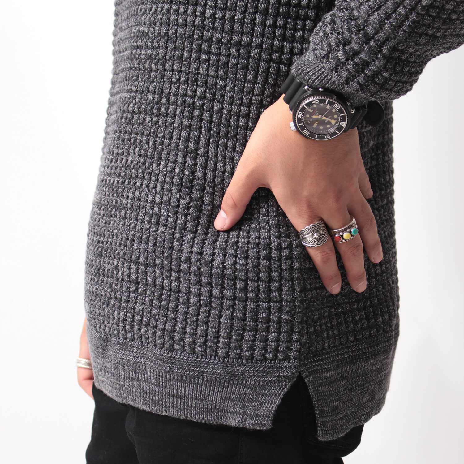 ワッフルと同じく保温性を目的として凹凸を付けながら、「蜂の巣」の形をしているのがハニカム。編地の表情が温かみある柔らかなイメージに。一枚着でも物足りなさを感じさせない存在感があります。