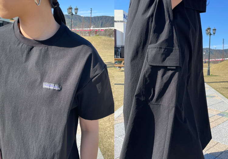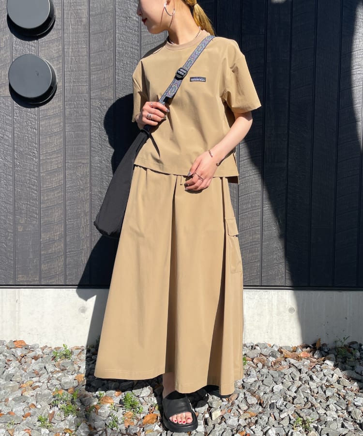 バッグに加えスカートにはカーゴポケットを配置し、シンプルながらこなれた雰囲気のアイテムに仕上がっています。