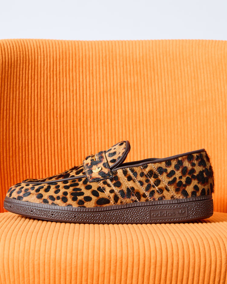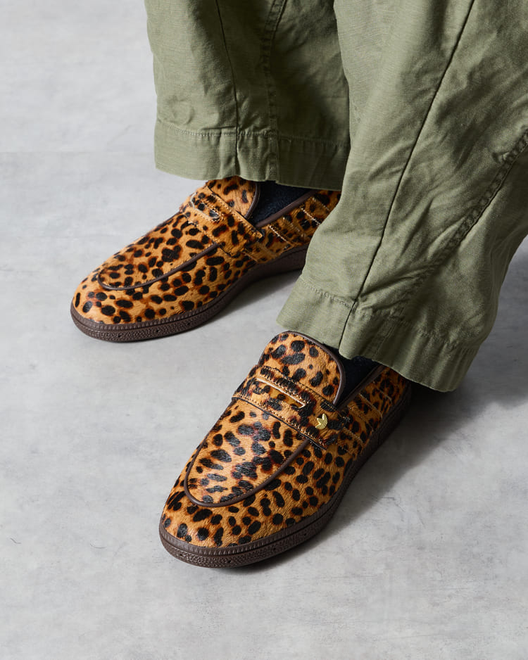 足元にはアディダスのハンドボールスペツィアルをベースにしたレオパード柄のローファーを着用。