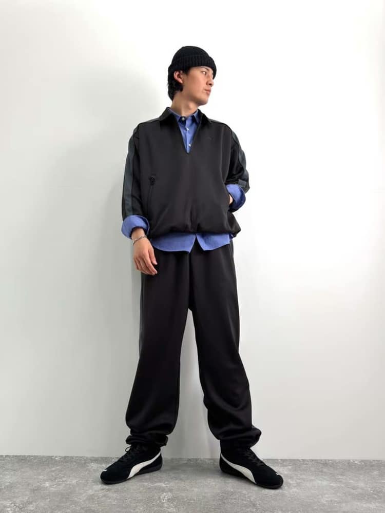 トラックジャケットとパンツのセットアップに、ブルーシャツをレイヤードしたスタイリング。