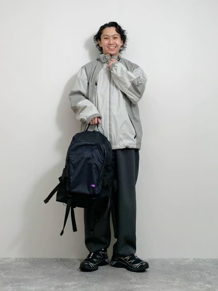 シェルジャケットにワイドパンツを合わせた、機能性を意識したアクティブなスタイリング。