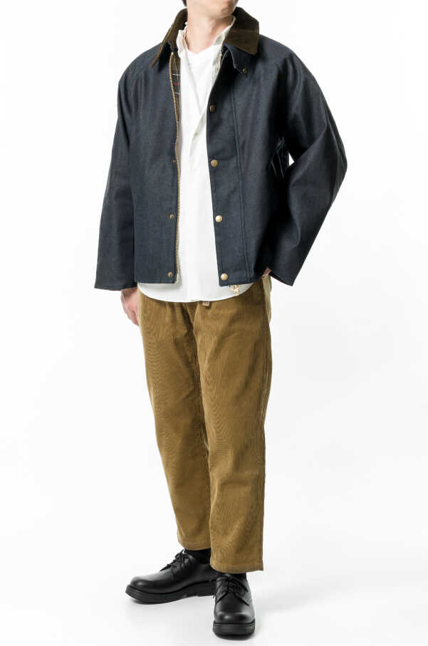 もう一つの新素材がコーデュロイ。細畝タイプで品よく、秋らしいウォーム感を演出するにも、これまた嬉しい素材のアレンジです。生地はコットン100%で、コーデュロイ独特の経年変化の表情を楽しむことができます。ウェビングベルトは生地と同色として、ヨーロピアンなシックな雰囲気が感じられるのも、巧みなアレンジなんだよな~。モデルカットのように、ハンティング調のジャケットにも相性抜群だしね。また表情に温かみのあるコーデュロイパンツは、ライトなアウターとの季節感あるバランス取りが◎。最近は冬が短く、秋が長くなってきてるし、暖冬なコーディネートにも素晴らしい活躍が見込めますね。
