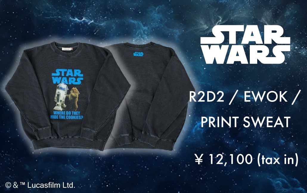 『スター・ウォーズ  /  ジェダイの帰還』より、「R2D2」と「イウォーク」のシーンを描いたキュートなデザインスウェット。