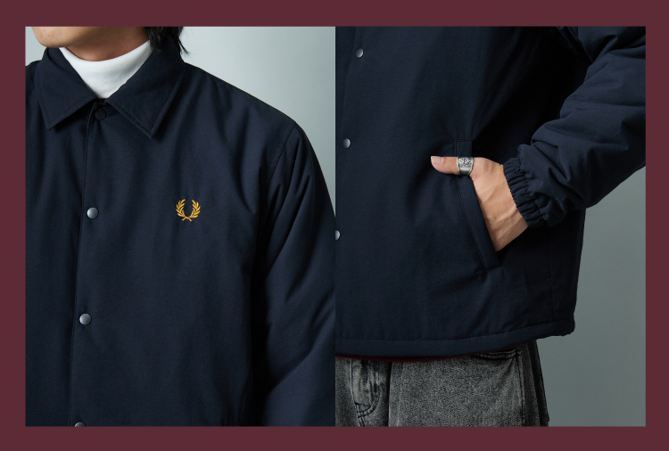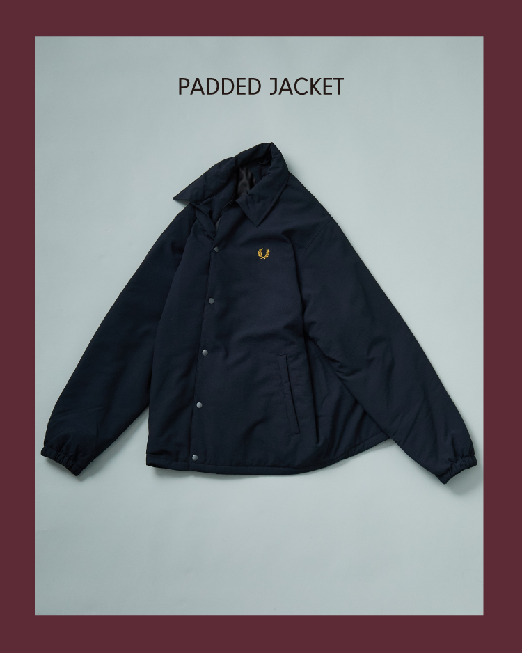 シンプルなルックスにブランドらしい上品を備えたFRED PERRY(フレッドペリー)の別注中綿入りジャケット。胸元のワンポイントロゴのみのデザインに、表地には表面感のあるポリエステル100%素材を採用。