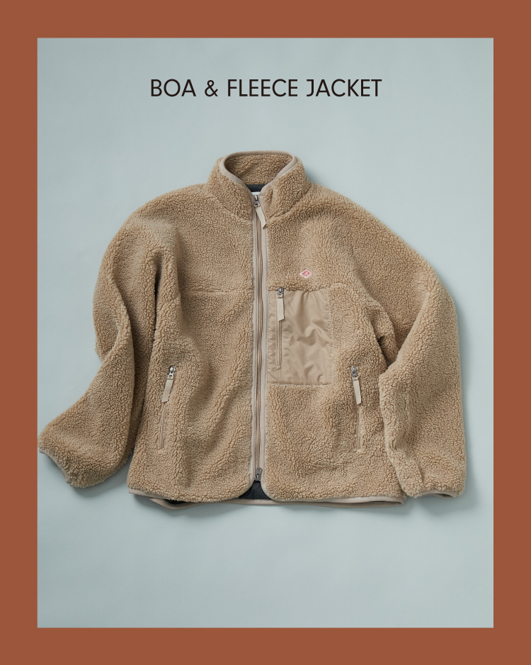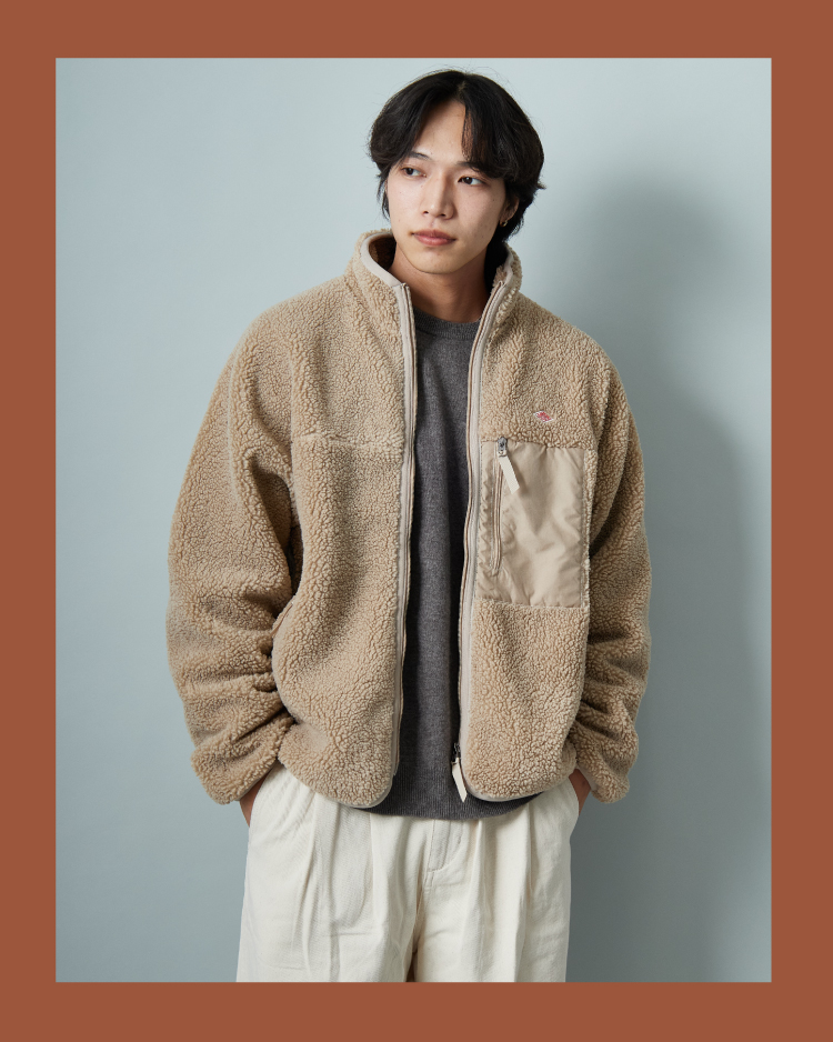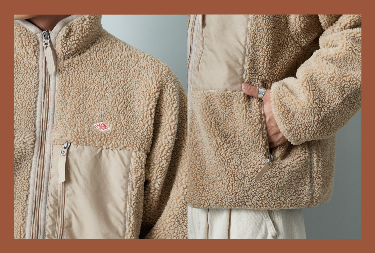 軽さと柔らかさが特徴のオリジナルライトボア素材を採用した、DANTON(ダントン)スタンドカラーボアジャケット。胸元にワンポイントロゴと、ナイロン切り替えのポケットを配したシンプルなデザインが特徴で、スタイル・年齢問わず合わせやすい一着です。