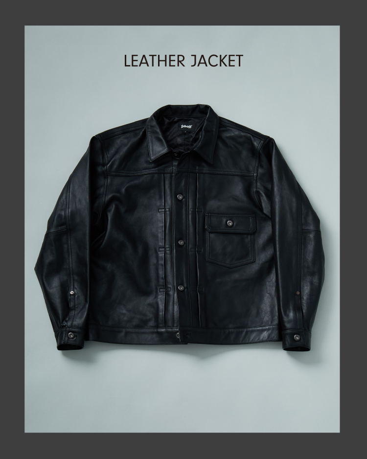 1stのデニムジャケットをベースに、上質なシープレザーで仕上げたSCHOTT(ショット)のレザートラッカージャケット。リジッドデニムを思わせる均一で美しい表面感は、無骨ながらモードな雰囲気も。