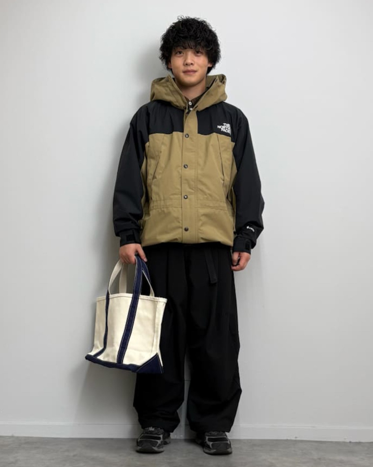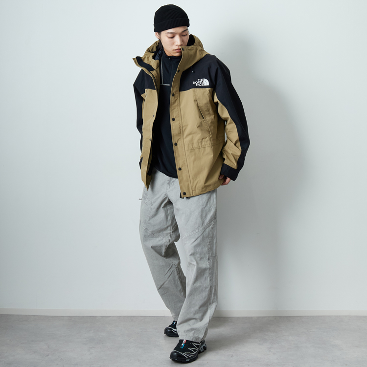 マウンテンライトジャケットの存在感を活かした、シンプルながらも洗練された着こなし。ワイドパンツで程よく抜けを出しつつ、全体のシルエットはすっきりとまとめています。