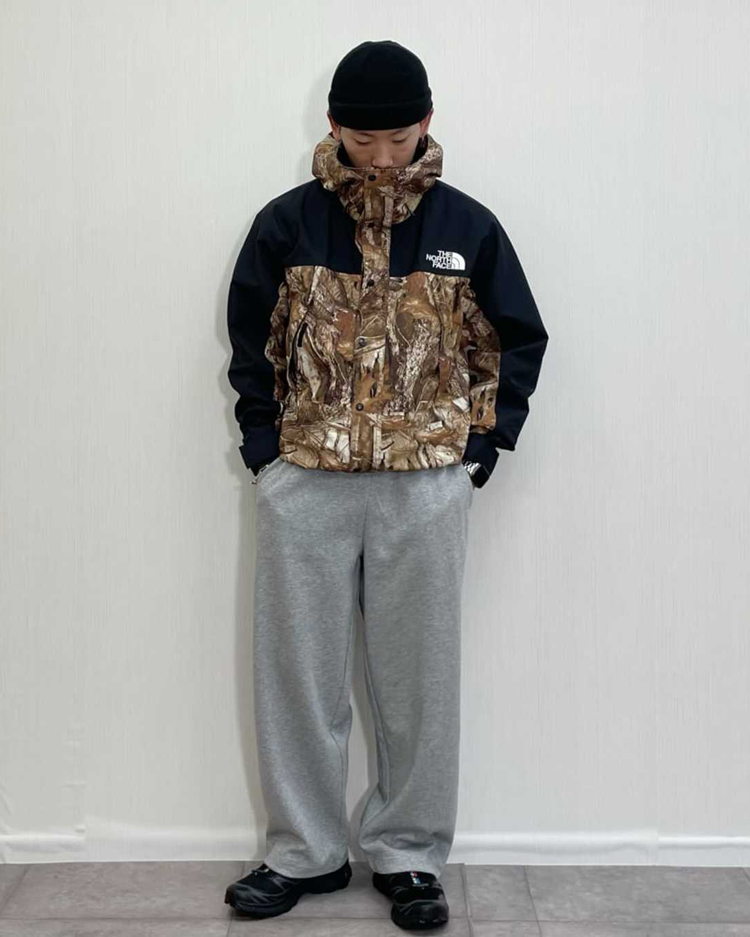 機能性と抜け感をうまく両立させたバランスのいいスタイリング。ゆったりとしたワイドパンツとスウェットを合わせて、アウトドア感の中にもリラックスしたムードをプラス。