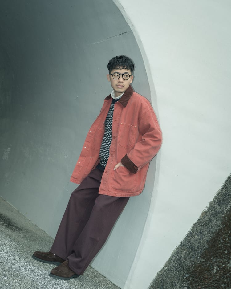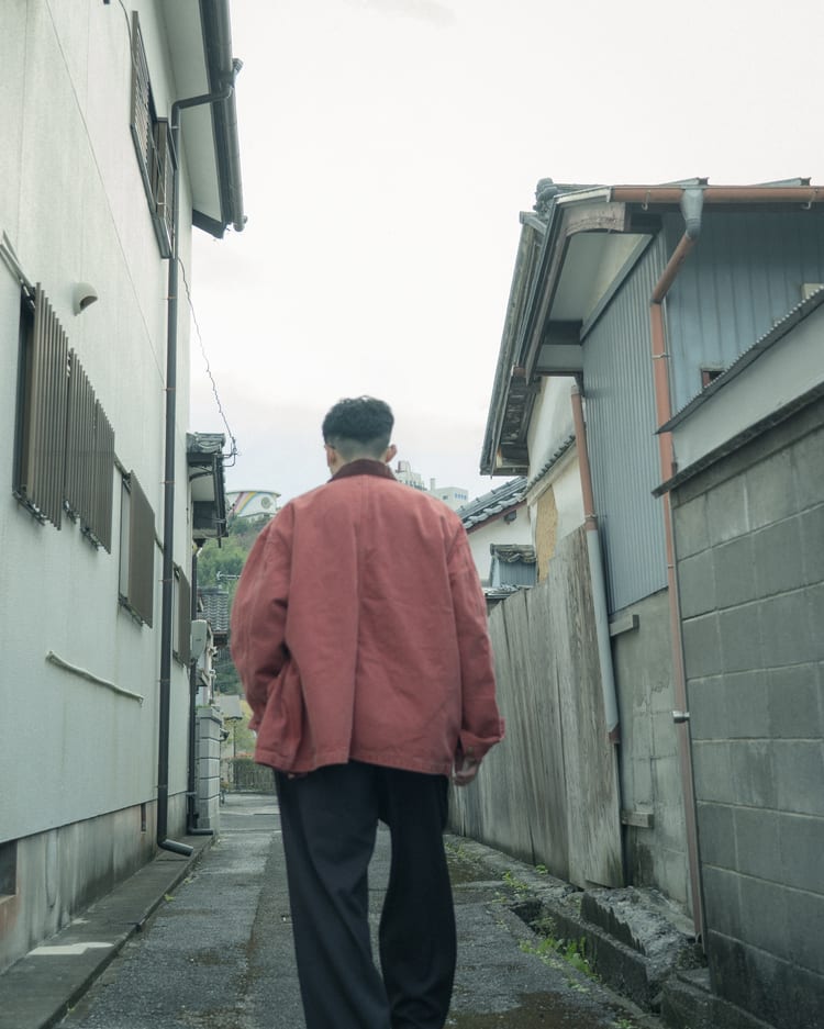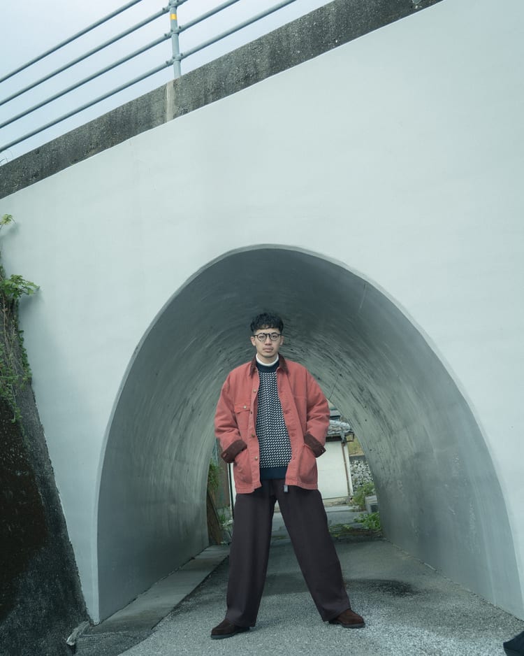 やや赤みがかったような色味が特徴のブラウン。味わいのある赤いカバーオールをメインに、バーズアイニットやワイドパンツで現代的な風を。