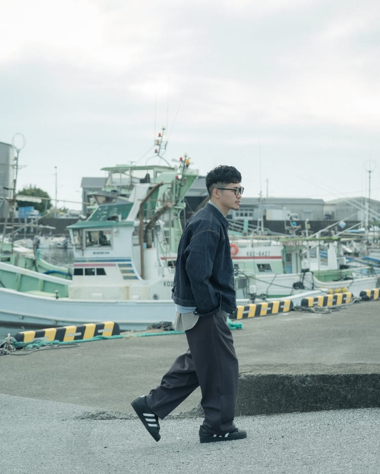 スラックスのような品を持ちながら、リラックスした雰囲気も感じられるチャコール。ワンウォッシュのデニムジャケットを軸に、ライトブルーのインナーやグレーのシャツで抜け感をプラス。