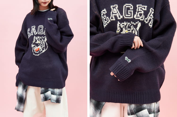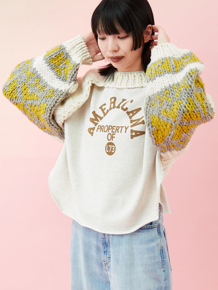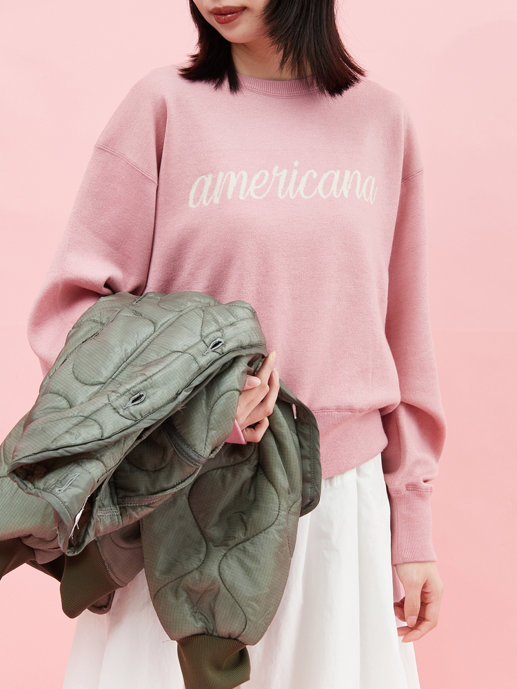 カジュアル派の大人女性から人気を集める Americanaの別注モデル。ロゴデザインをジャガードで編み込み、プリントには出せない柔らかな立体感と上質感を楽しめる一枚です。 まるでスウェットのような軽さとリラックス感を持ちながら、ニットらしい伸びやかな着心地とあたたかさを両立。裏毛スウェットよりも上品に着られるため、カジュアルになりすぎず、冬のデイリースタイルにちょうど良いバランスをもたらします。