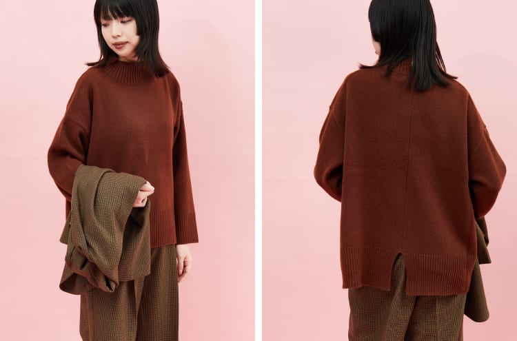 ニットは素材感や編地によって表情が大きく変わるため、「どんなボトムと合わせる?」「アウターの相性は?」といったお悩みも、実際の着こなしを見ることで一気に解決。