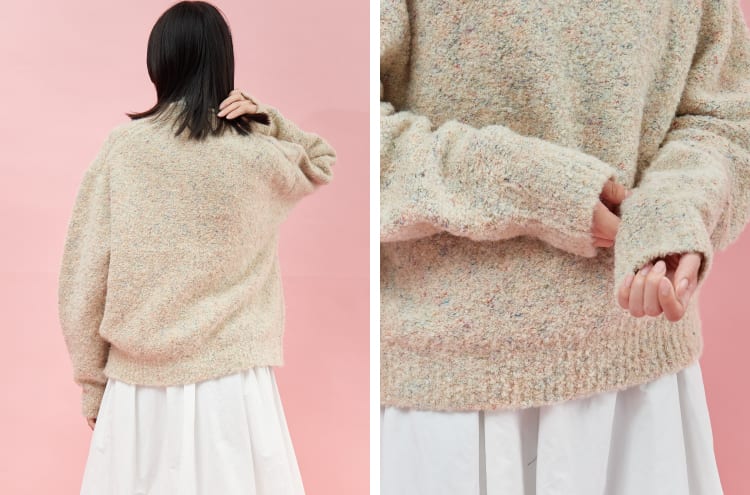 やわらかな“ミックスヤーン”の表情が魅力の、MICA&DEALの大人向けニット。複数のカラー糸をブレンドした豊かなニュアンスが、無地ニットでは出せない奥行きとこなれ感を演出してくれます。光に当たるとわずかに色が揺らぎ、上品なムードが自然と漂うのもポイント、シンプルながら女性らしい雰囲気をつくります。