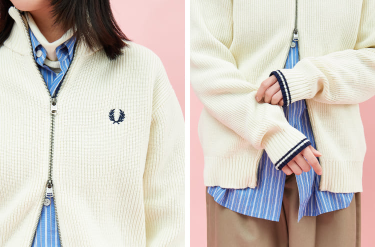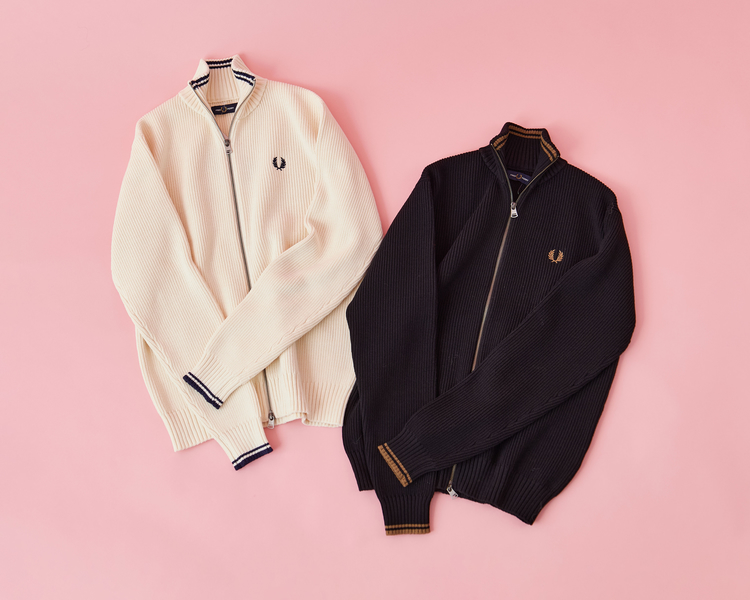 今年注目の“グランパコア”を大人っぽく取り入れるなら、まず手に入れたいのが FRED PERRY 別注のドライバーズニット。クラシックな雰囲気と上品なスポーティさを掛け合わせた一枚はアウター感覚でも羽織れる ダブルジップ仕様、シャツやタートルを合わせるだけで一気に“ぬけ感のあるクラシックスタイル”が完成します。