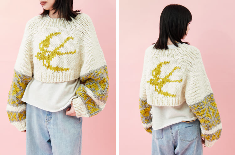 冬の装いに温もりと個性を添えるなら、RhodolirioNのカウチンニットボレロは外せない存在。 手編みのの風合いと、大胆なジャガード柄が視線を奪う、唯一無二のデザインが魅力です。バックに描かれたスワローモチーフはブランドらしいアイコニックなアクセント。厚みのあるニットながら、ショート丈のバランスで重たく見えず、前後どちらでも着用OKな2WAY仕様。ロンTやスウェットに重ねるだけで個性的なレイヤードスタイルが完成します。