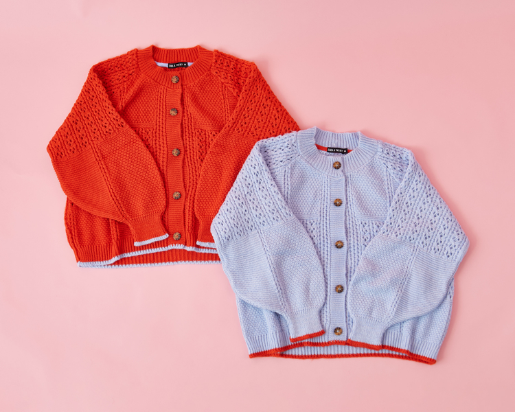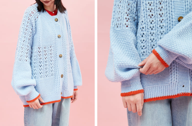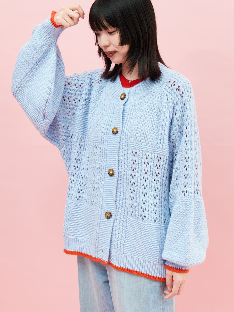 英国発のニットブランド CARA & THE SKYが届ける、遊び心あふれるバルーンスリーブカーディガン。ハンドクラフトの温もりを思わせる立体的な編み模様と、美しい色使いが魅力の一枚です。
