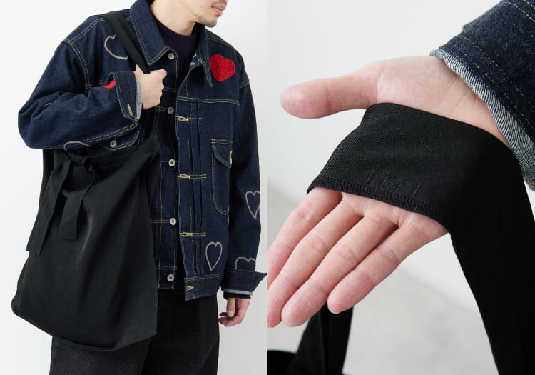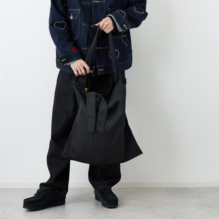 裏返したようなユニークな構造が目を惹く、メリーインサイドアウトトートバッグ。ミリタリーテイストを感じさせつつも上質な光沢を持つ、オリジナル開発のナイロン素材を採用。