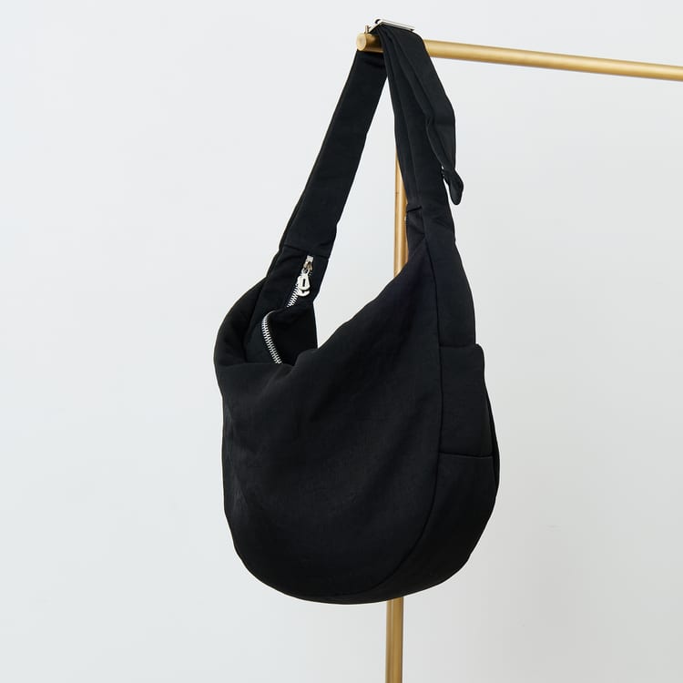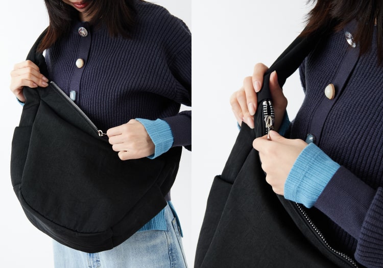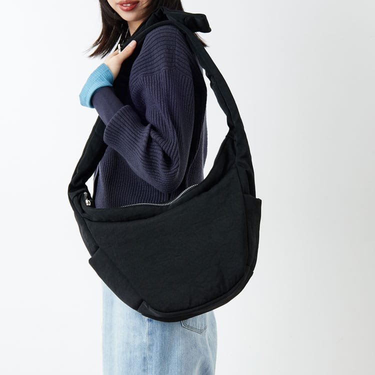 丸みのある三日月型のフォルムが印象的な、アニーパファームーンバッグシリーズ。前述のトートバッグと同じ、オリジナルのナイロン素材を使用しており、持ち手が自然にたわむことで柔らかなラインが生まれ、持つだけで美しいシルエットを演出します。