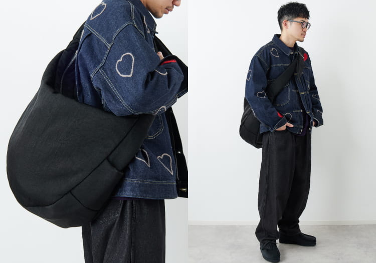 イッチのバッグは、コーディネートの主役になるというよりも全体を引き締める存在。余計な装飾を排したデザインだからこそ、オン・オフ問わずさまざまなスタイルにすんなり馴染みます。
