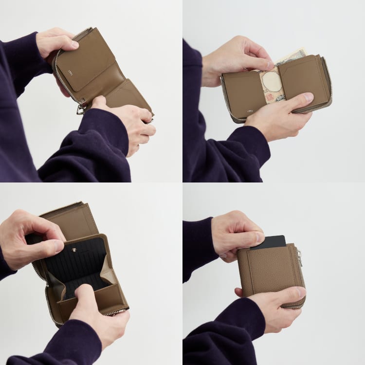 ボックス型のコインポケットに加え、11枚分のカードポケット、2つのフリーポケットを配置し、小銭やお札、カードを整理しながら収納可能。長財布ほどの容量は必要ないものの、しっかりとした収納力を求める方や、領収書をきちんと管理したい方に特におすすめ。