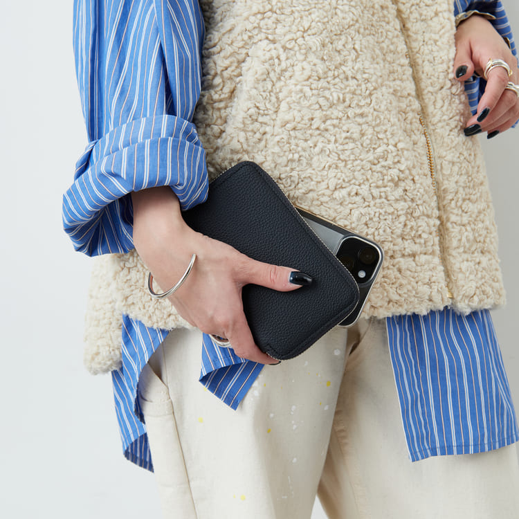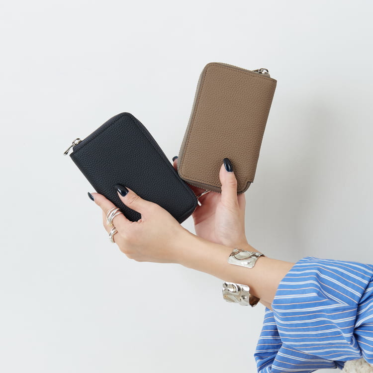 素材はコンパクトウォレットと同じレザーを使用しており、厚みを抑えたスマートなフォルムは、ジャケットやパンツのポケットにも自然に収まります。