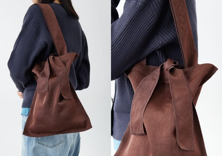 中央のベルトを結ぶことで手持ちスタイルにもアレンジ可能で、まるで洋服のように繊細な気遣いと遊び心が詰まった一品です。