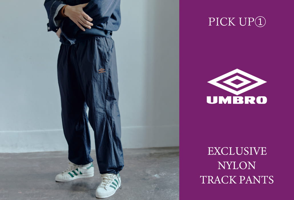 ストレスのない穿き心地と、街に映えるクリーンな印象を両立したUMBRO別注ナイロントラックパンツ。