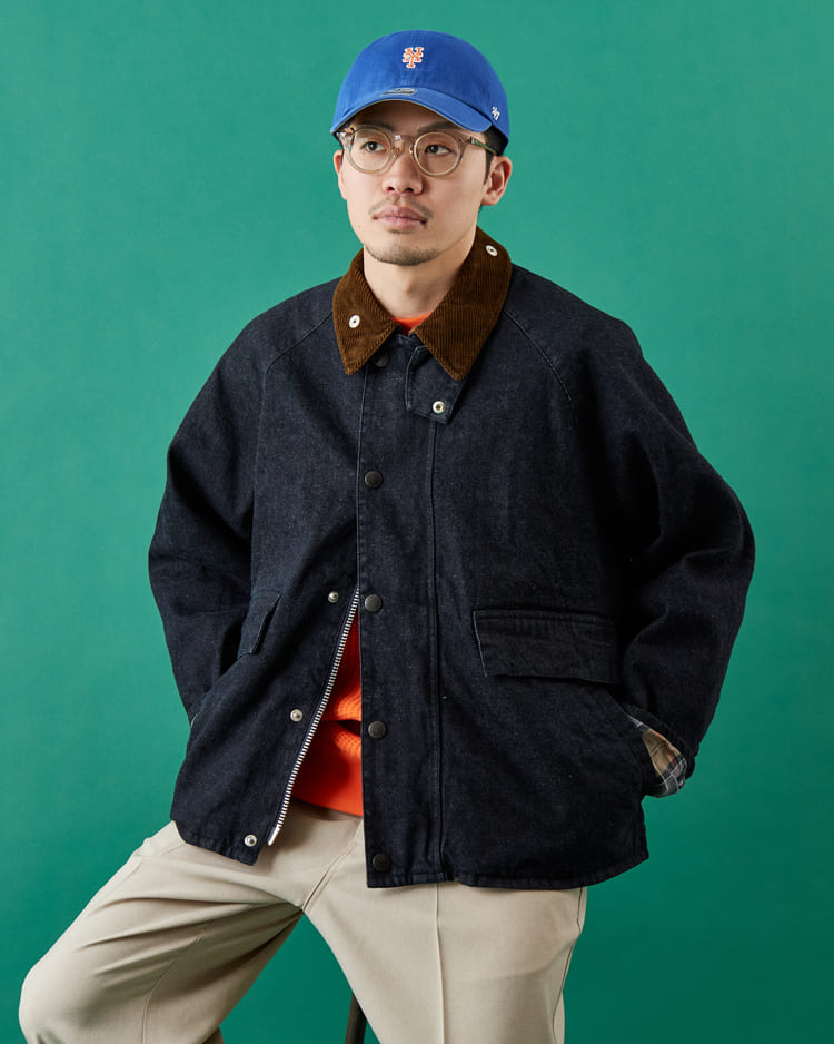 チンストラップを留めることで首元に程よい緊張感が生まれ、デニムのカジュアルさの中にバブアーらしい機能美が際立つ印象に。着こなしの雰囲気を切り替えられる点も、このモデルならではの魅力です。