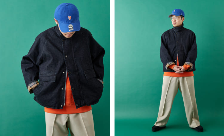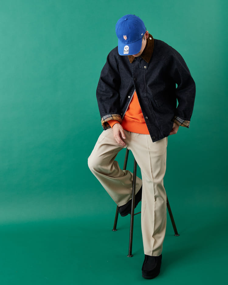 インナーにはネイビーと相性の良いオレンジのサーマルを合わせ、重くなりがちなデニムに明るさと季節感を添えています。