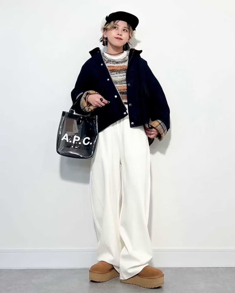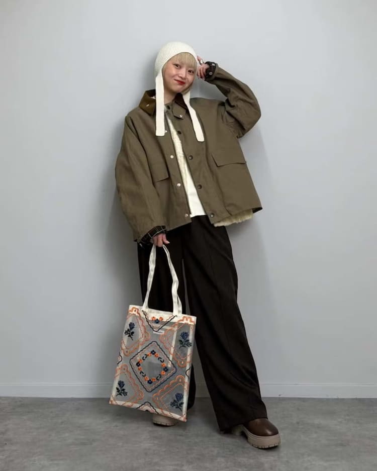 袖を折り返した際に、裏地のチェック柄がアクセントとして現れ、コーデを華やかに彩ります。