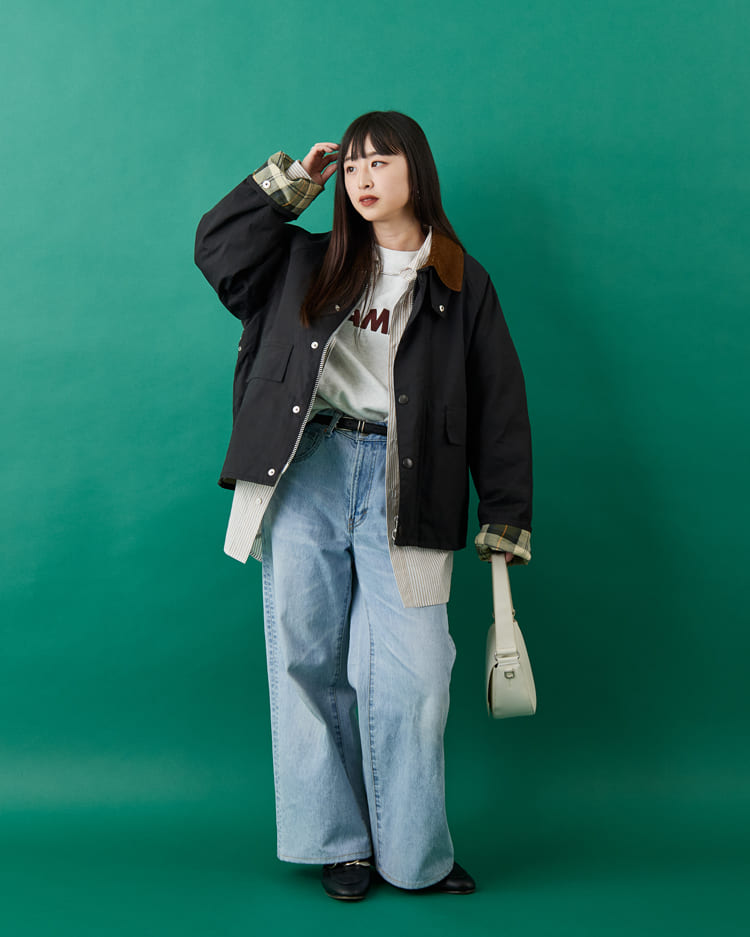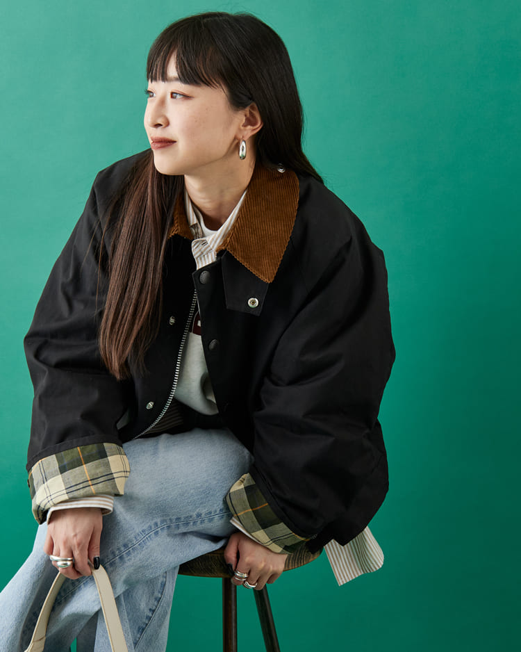 ショート丈のボロウデイルを羽織ることで、レイヤードしても重さを感じさせず、全体のバランスもすっきり。