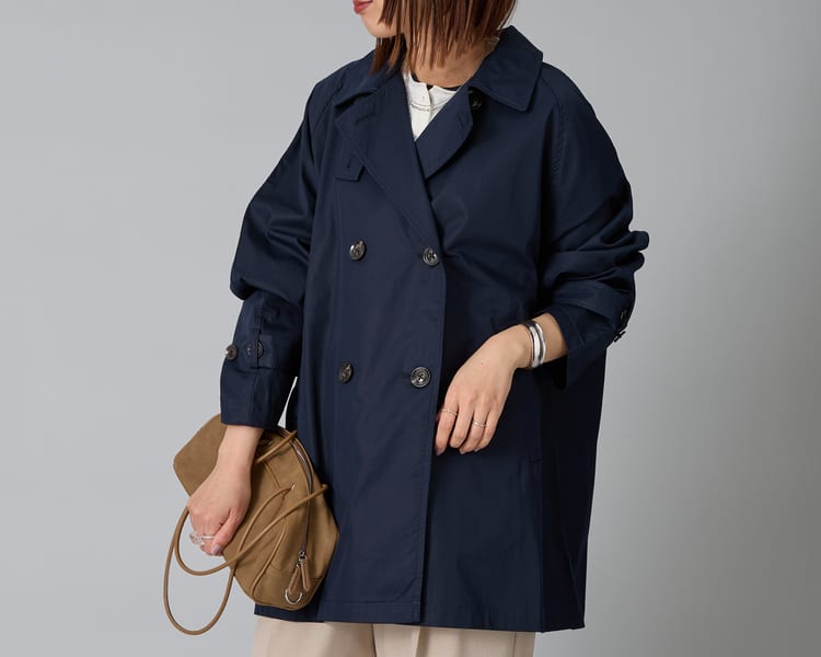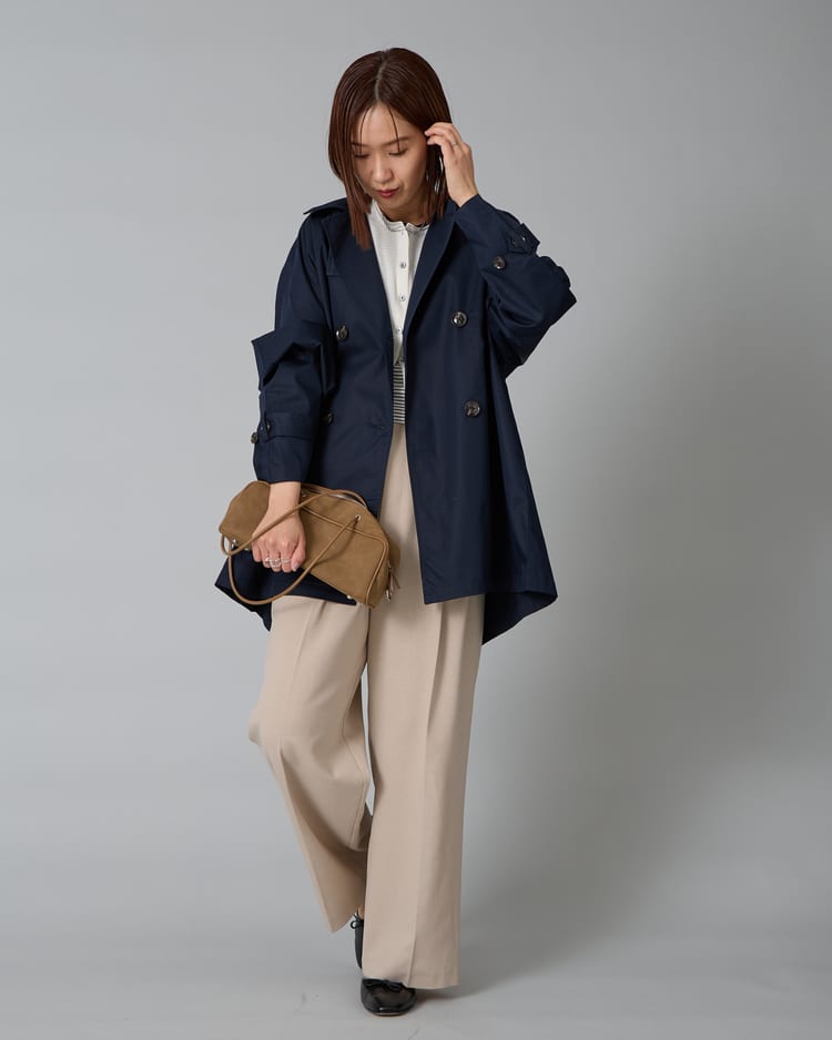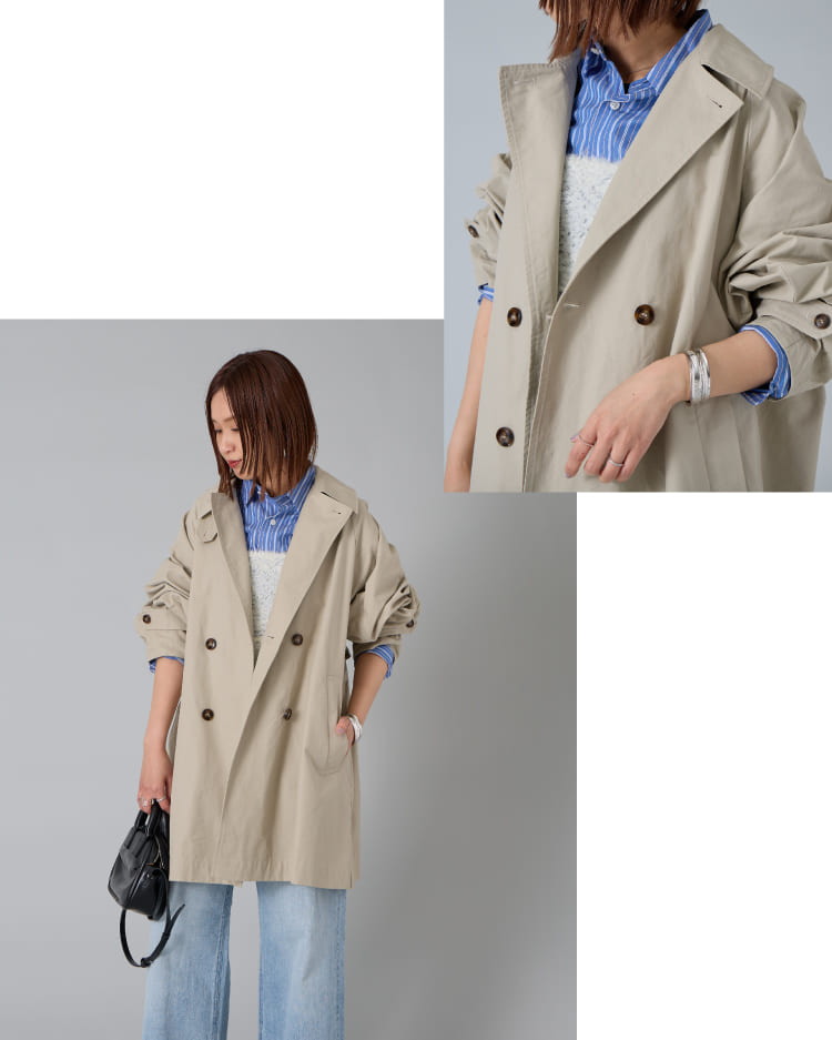 セレモニーシーンなら、ブラウスやハイゲージニットにタックパンツ、足元はローファーやヒールで端正に。ダブルブレストのクラシックさが、式典や会食の場でも浮かず、ほどよい華やかさを添えてくれます。素材は本体コットン100%でハリ感がありつつ、軽やかな着心地に仕上げた設計。