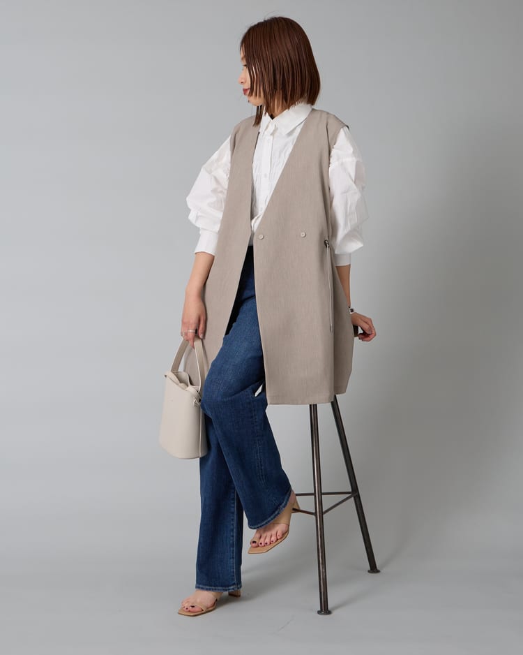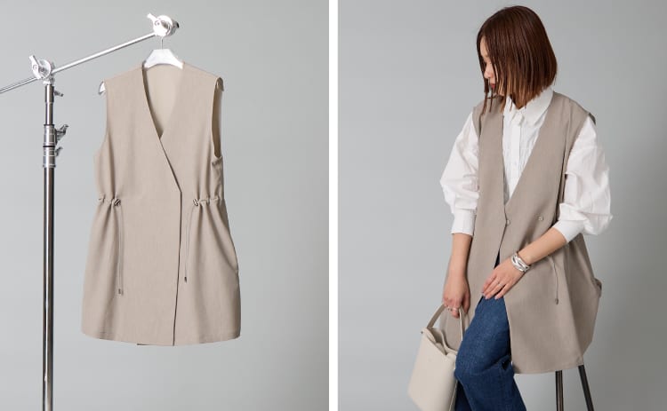 Tシャツ×デニムのようなラフな組み合わせも、シャツやブラウスのキレイめスタイルも、上から重ねるだけで縦ラインが強調されてスッと洗練。大人のキレイめスタイルを格上げします。