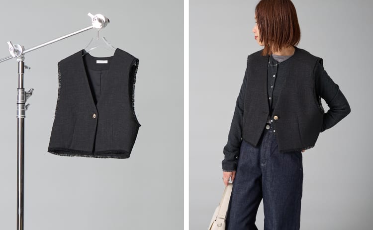 ツイードの立体感で、シンプル服が即“格上げ”できるCHIGNONのツイードベストはキレイ目はもちろん、カジュアル派にもおススメしたい1着。